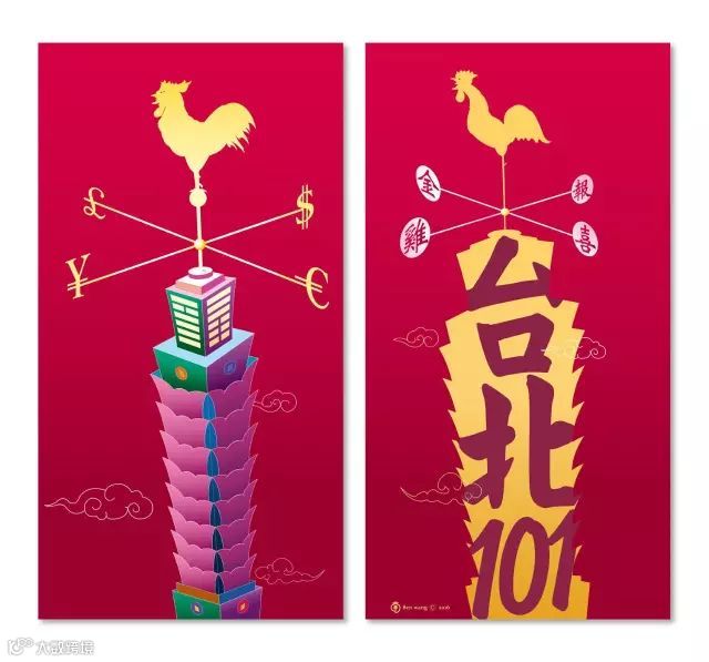 台北101是台湾最著名的建筑,以台北101大厦为元素,加上鸡年的元素,寓意金鸡报喜,四方来财。