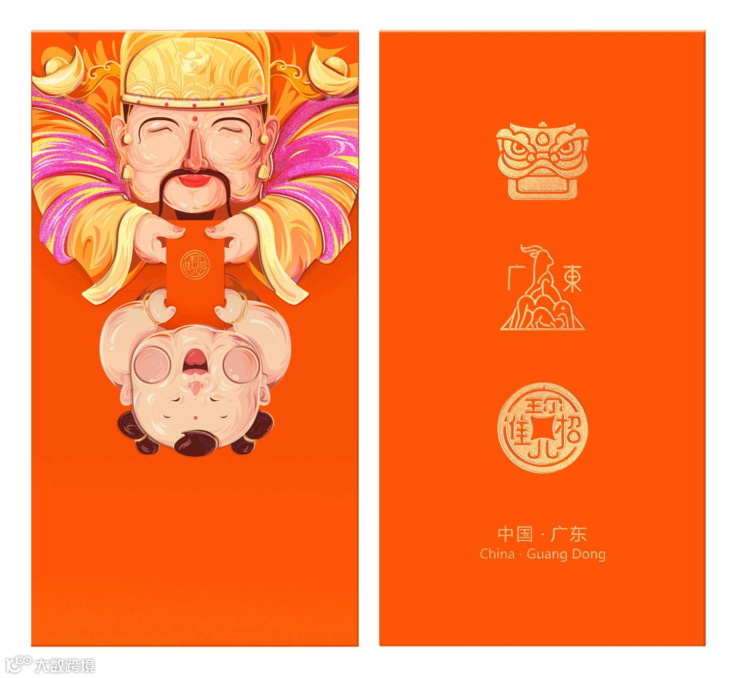 过年的时候,广东地区,以及香港大街小巷都是金和红的色彩,各家各户都贴满了对联和财神爷,此红包的主题即是一个财神送红包给小孩压岁钱,非常有传统的寓意。而正面用了广东常见的元素:舞狮头,广东标志性的五羊,过年喜欢的招财进宝...