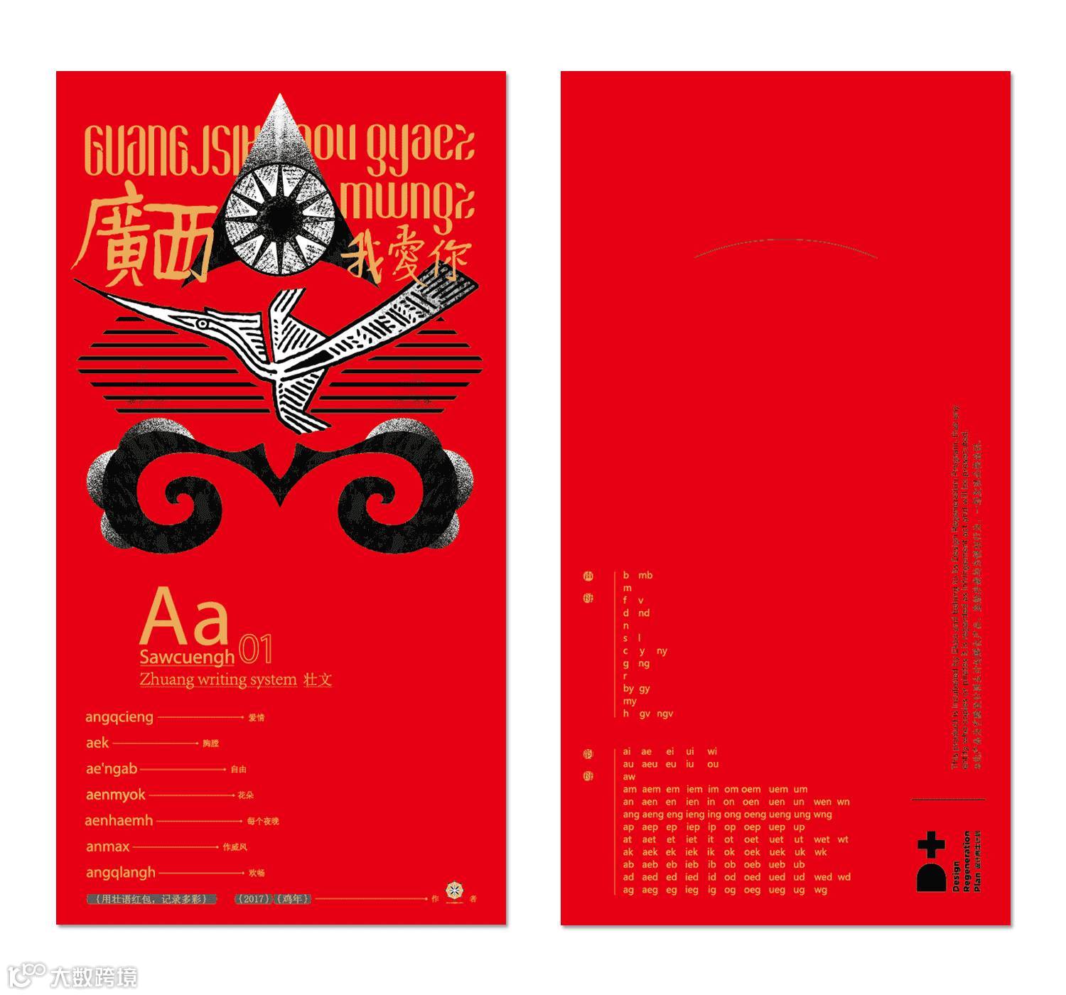 在文化流失严重的广西,必须要用强烈的符号来敲醒,我为家乡做一款红包,就必须用壮文!在壮文的艺术字设计上,采用同样具有标志性意义的太阳纹、铜鼓、鸟人、云雷纹的元素。这款红包,采取26个壮文字母的首字,有象征性。