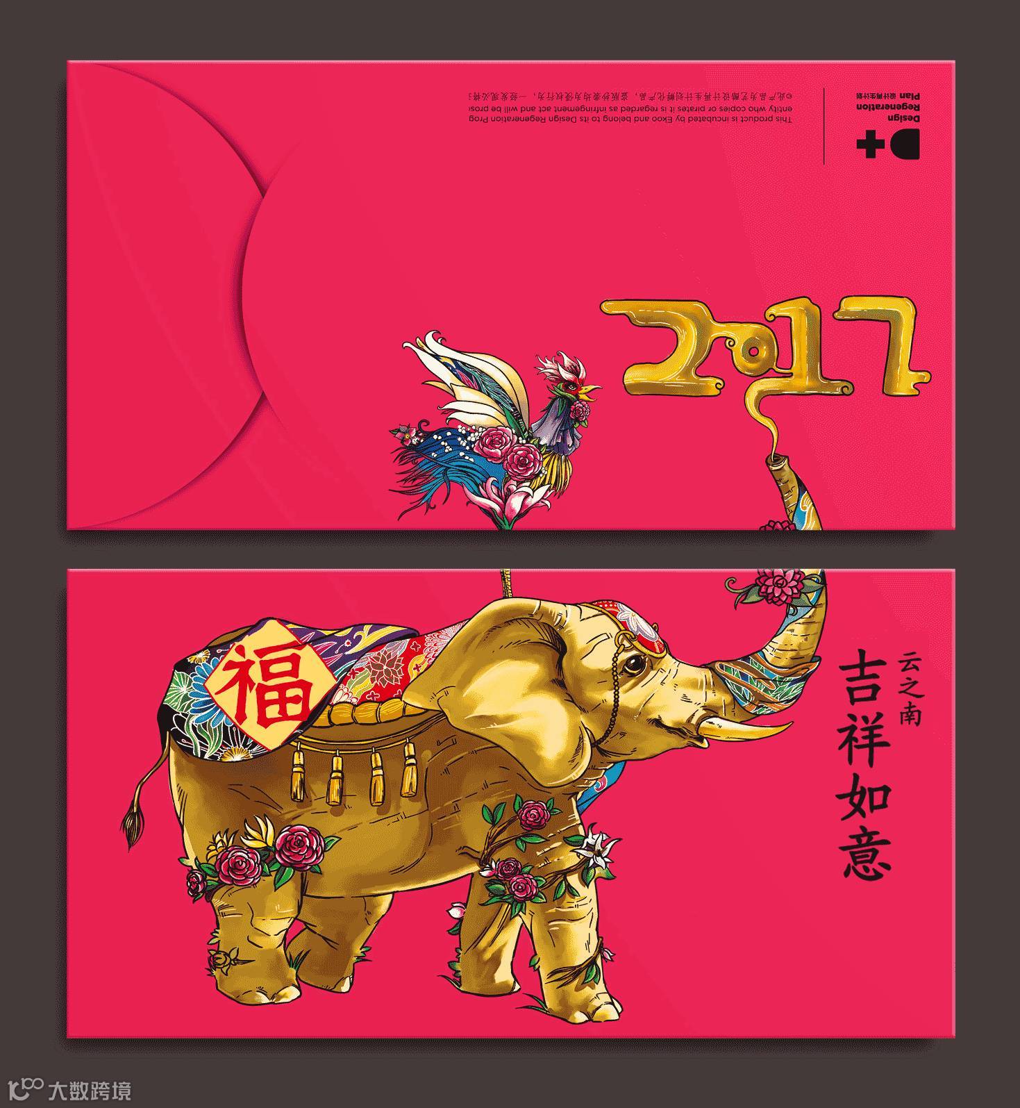 是贺兰山原始岩画与西夏文字,是这次设计创意的原点。西夏文的造字规律有其独特性,合成字手法是其一,比如“泥”字是由“水”与“土”合成。红包的创意即是把西夏文的“吉祥富贵”用汉字合体字的手法写出,形成一个新的吉祥喜庆符号,表达节日的问候。