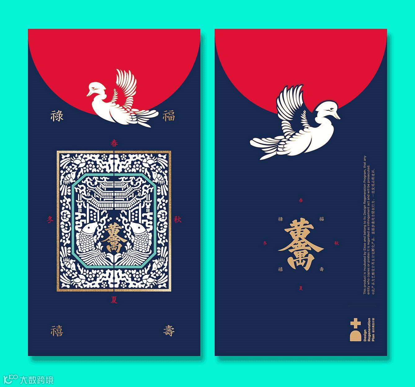 绍兴出师爷,温州产夹缬,红包的创作元素也来自于这两个地方。从唐代的《花树鸳鸯纹夹缬褥面》到近代的《鱼跃龙门夹缬褥面》都提取了元素,再融入吉祥贺语,组成了一幅青天红日图。正所谓:春夏秋冬,黄金万两;福禄寿喜,鱼跃龙门。