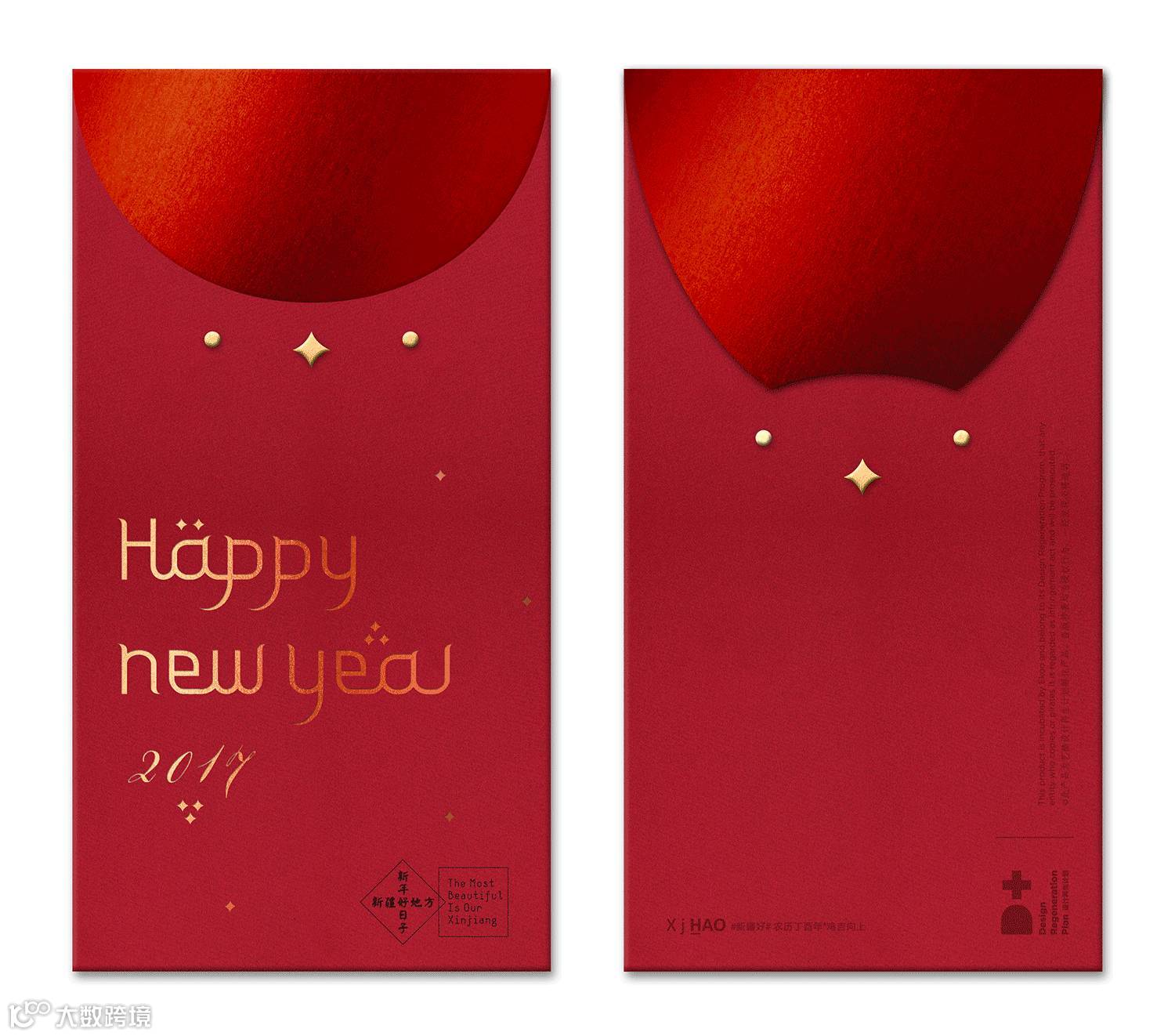 红包主文字在HAPPY NEW YEAR的识别基础上融合了新疆维吾尔文字的特征。正面13颗闪烁的星形象征新疆的13个世居民族。