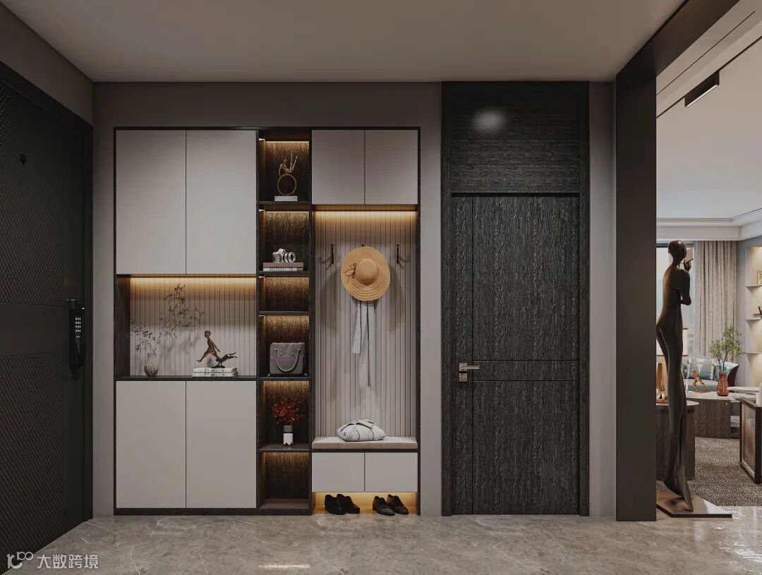 设计师搭配合理的收纳规划,划分出了换鞋区域、挂衣区、展示区等,经由层板灯的暖黄暮光渲染,绽放出优雅的视觉感象,让每次归家的温暖沁润心房。