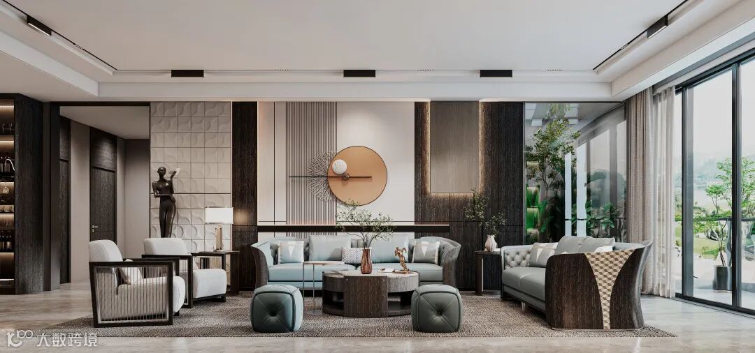 步入客厅空间,我们可以感受到设计师注重个性、舒适、精致、时尚,且让现代时尚与自然质感做到了有机平衡。家具设计中,整体更显方圆,沙发上柔和的木皮弧形与定制遥相呼应。