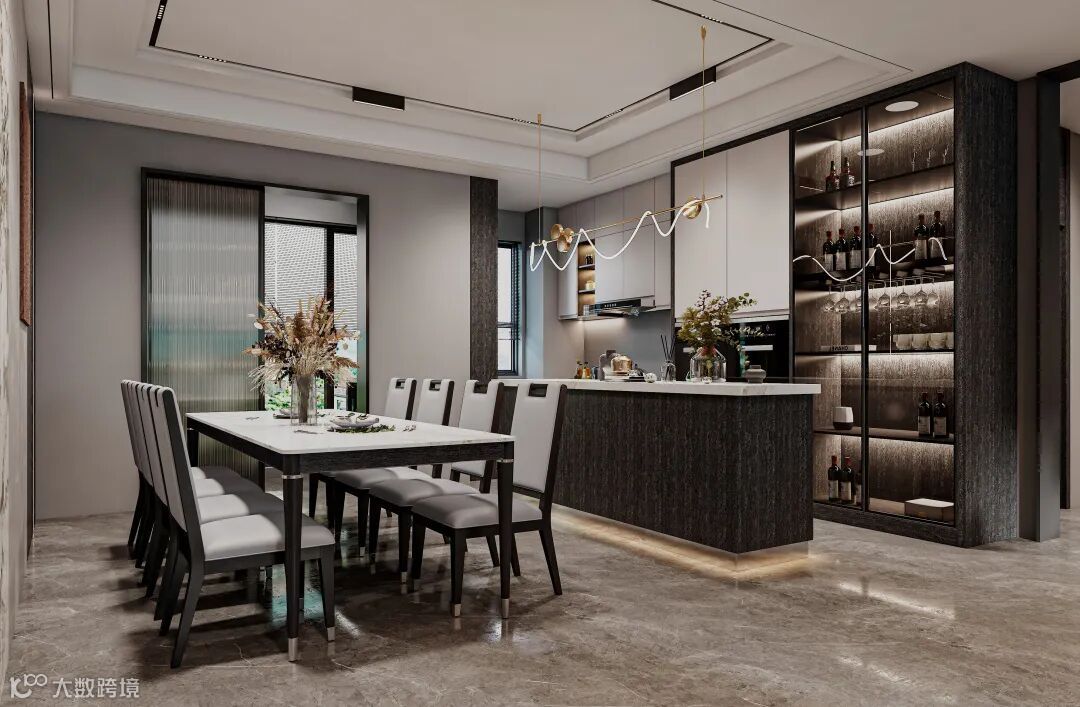 餐厨设计打破常规,采用开放式格局,更显高级。餐厨之间的玻璃元素与简约的灯具作为当代风格的代表元素,准确的传达出空间的现代美式时尚特质。