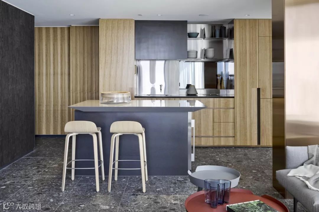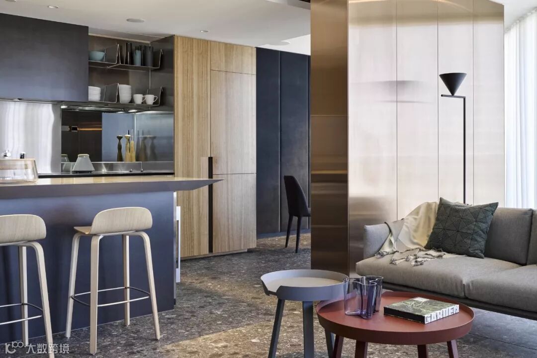 公寓的住户内部,金属和木料是家具的主要材料,通过颜色的深浅搭配,营造出错落有致的空间感。