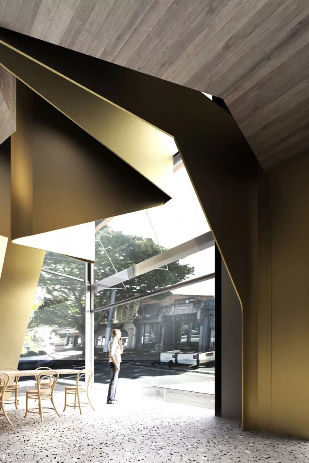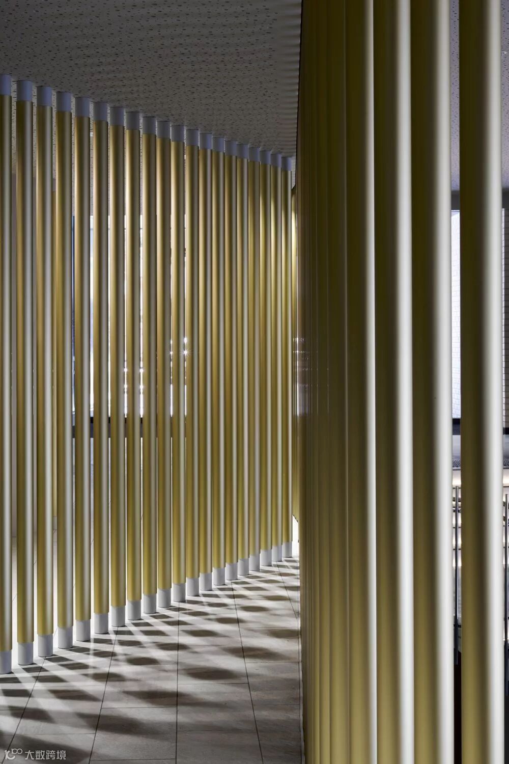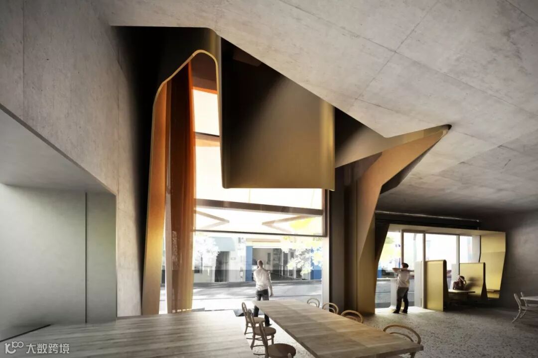 大堂的设计则是用巨大的金属曲面来进行室内装饰,与周围的混凝土、水磨石材料形成强烈的视觉对比,极具冲击力和戏剧效果 ▼