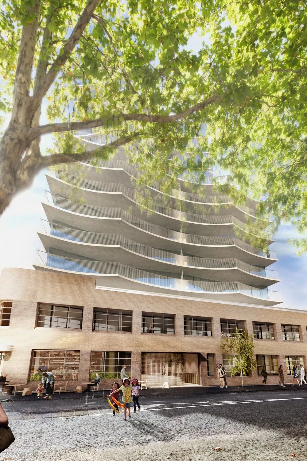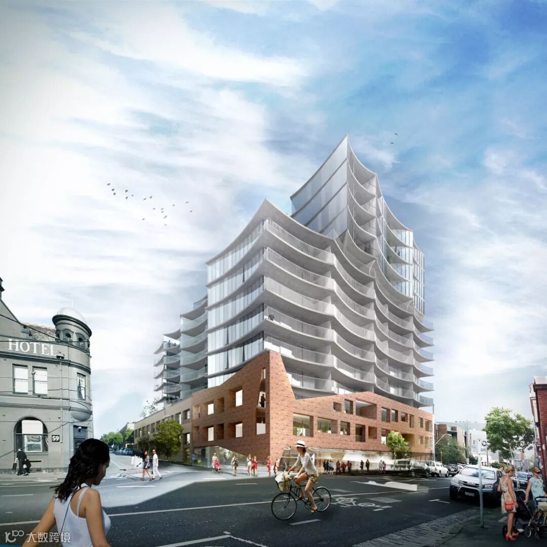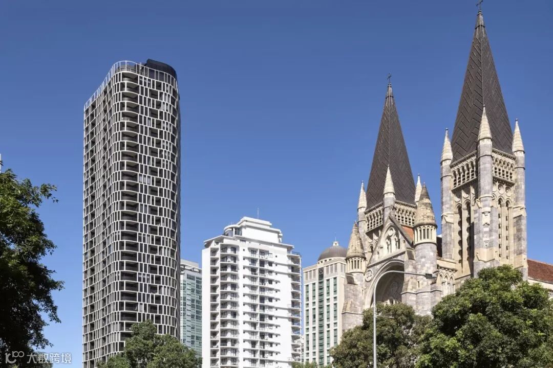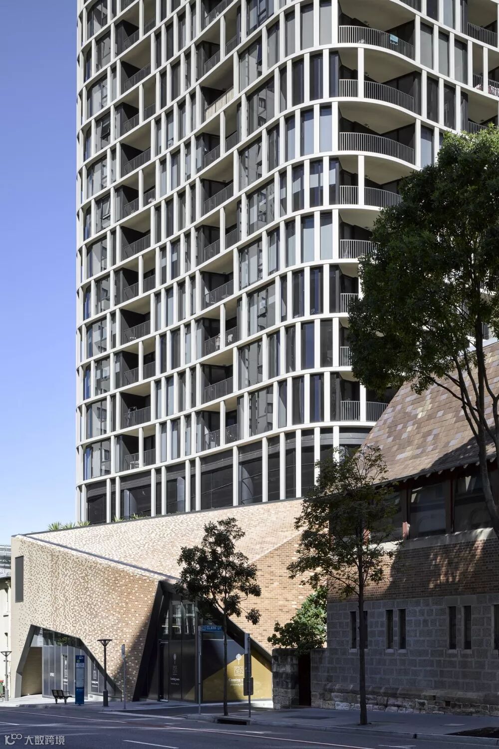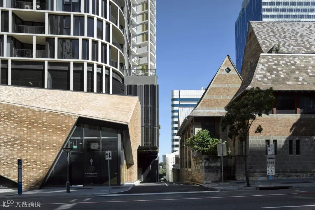 位于澳大利亚布里斯班的这座住宅塔,位于当地的历史建筑旁。为了融入其中,大楼用石砖砌成了裙楼,意味着年轻现代与文化遗产的过度 ▼
