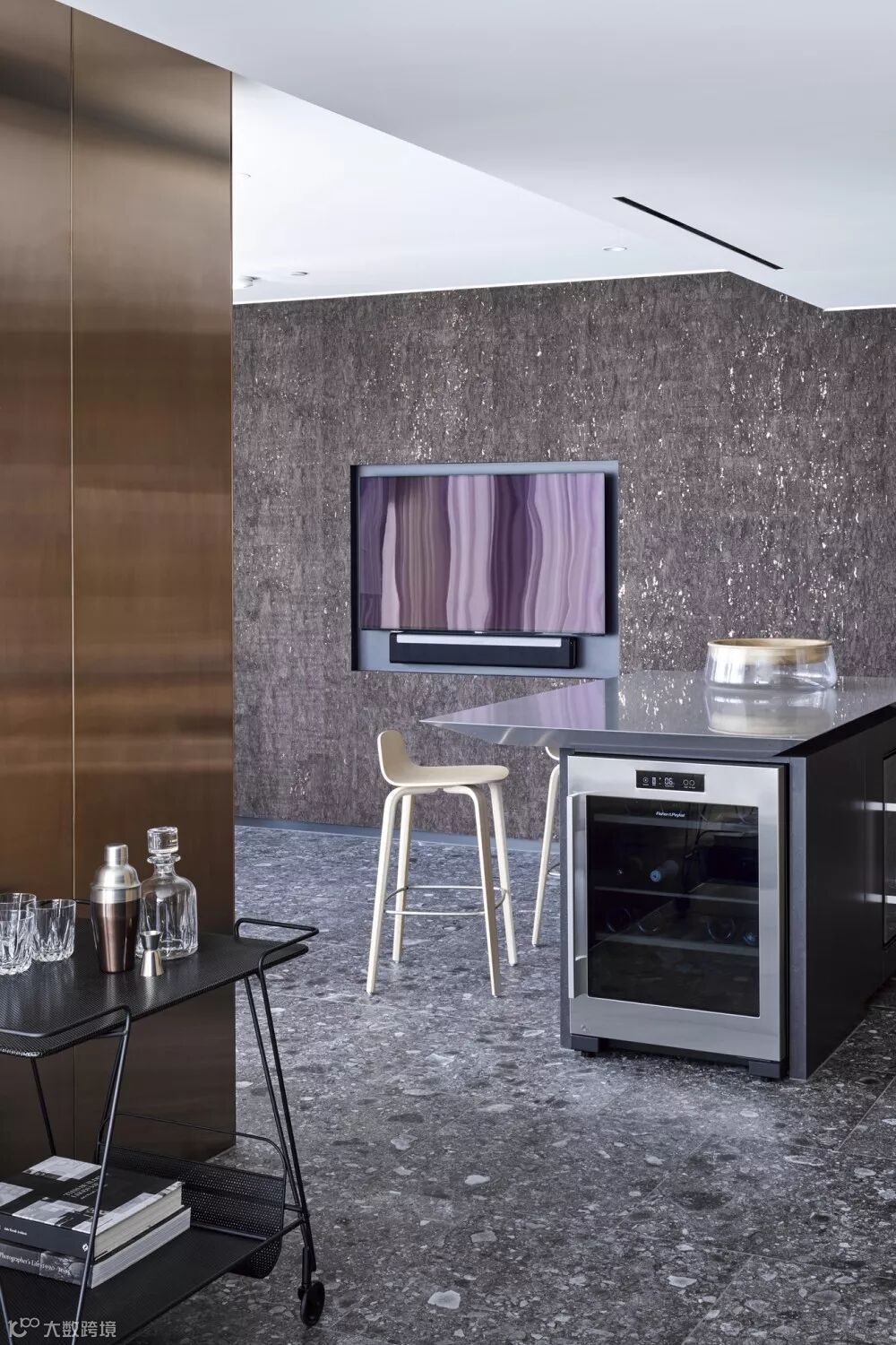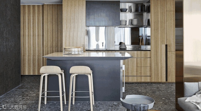 这个公寓的室内有着非常强烈的纹理感,包括墙面、地板和家具,在木料和金属的表面都有着低调的处理效果。