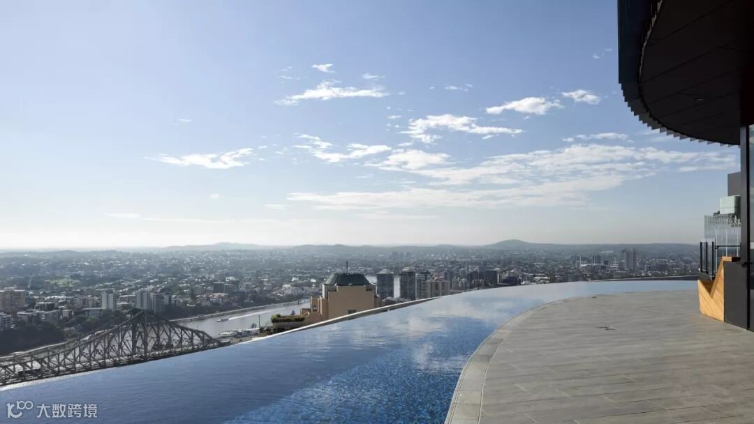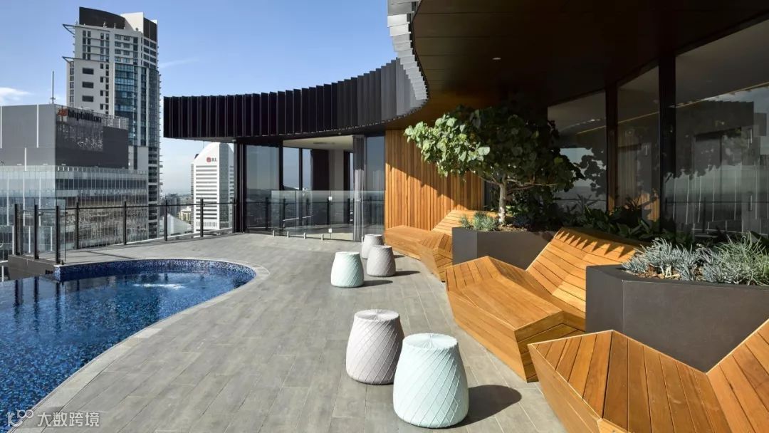 位于顶层的别墅还设置了私人的户外泳池,没有边栏的设计让泳池与天际线相连,可以最大程度的看到城市的景色。