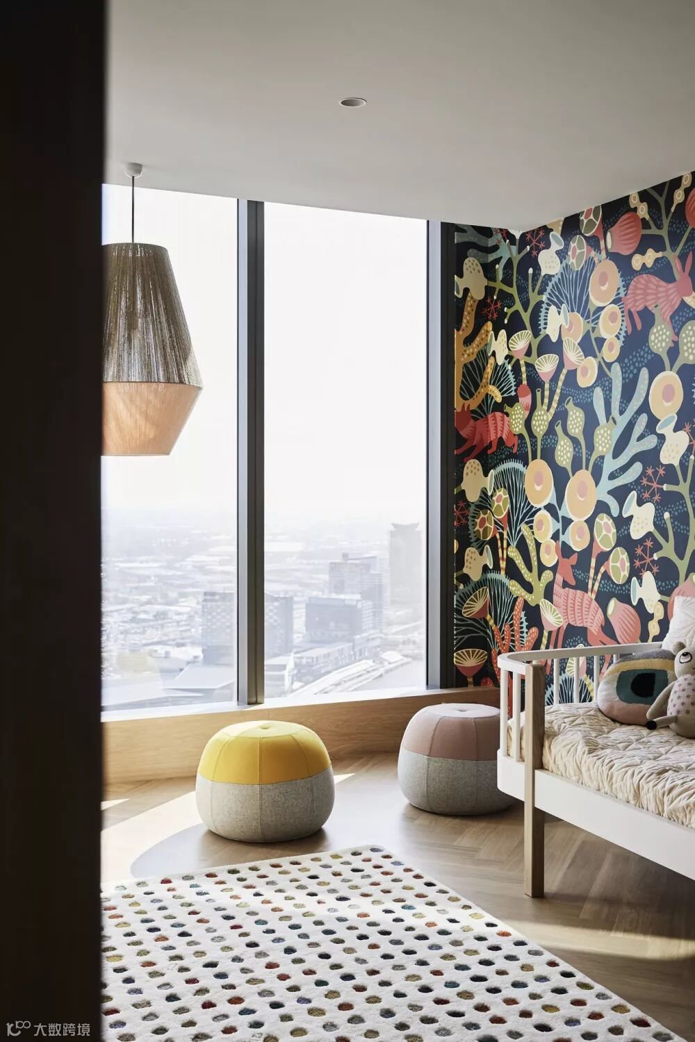儿童房的墙面贴上了色彩鲜艳怡人的壁纸,并且在家具的选择上更充满自然感 ▼