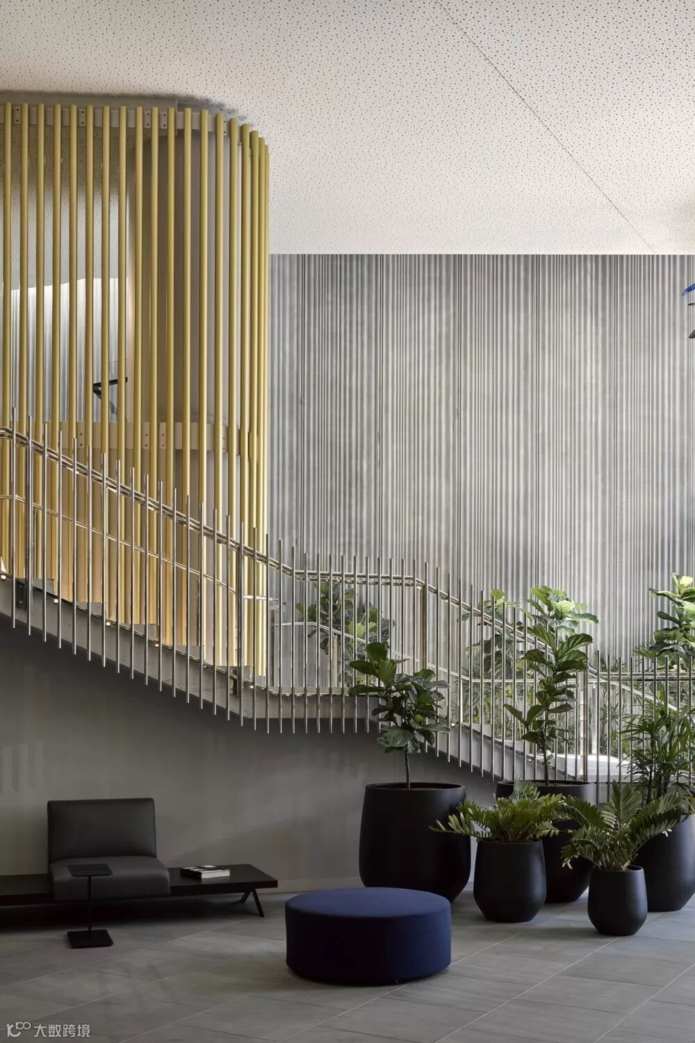 在宽敞的大堂,楼梯与过道都由金属的细长柱子所包围,提供视觉连接感。这种弱隔断也让整体空间氛围更加通透。