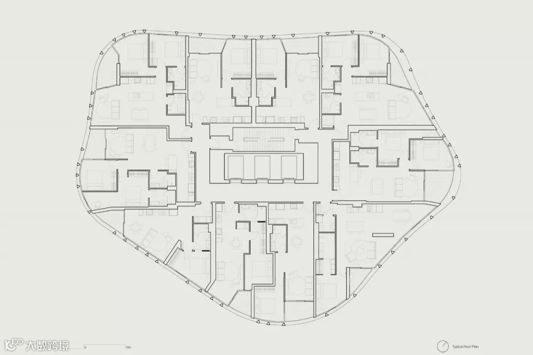 这栋公寓楼的建筑外形受到筒仓的启发,拥有着向内弯曲的曲线设计。