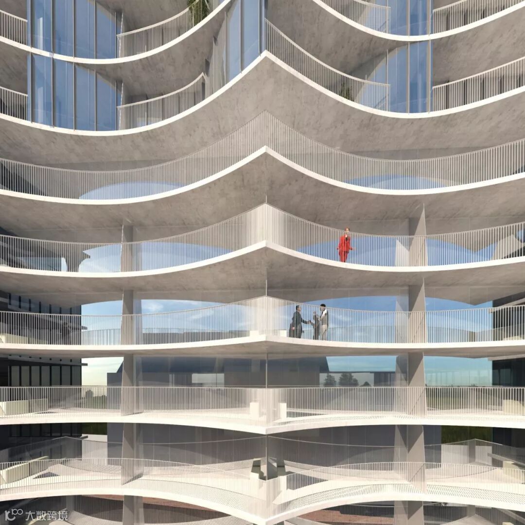 住宅塔楼的立面充满了大小不一的格子,并且连接成一块曲线平面,既可保证隐私,同时在遮阳、视线等功能方面进行水平的扩展和延伸。