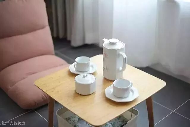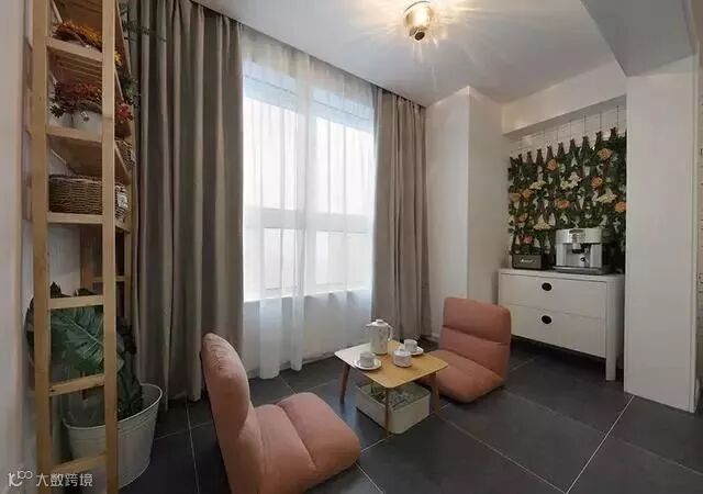 小茶座简简单单,旁边的装饰也是绿植与原木色的架子,契合整个家的自然风格;