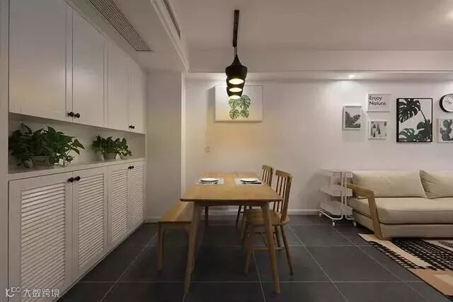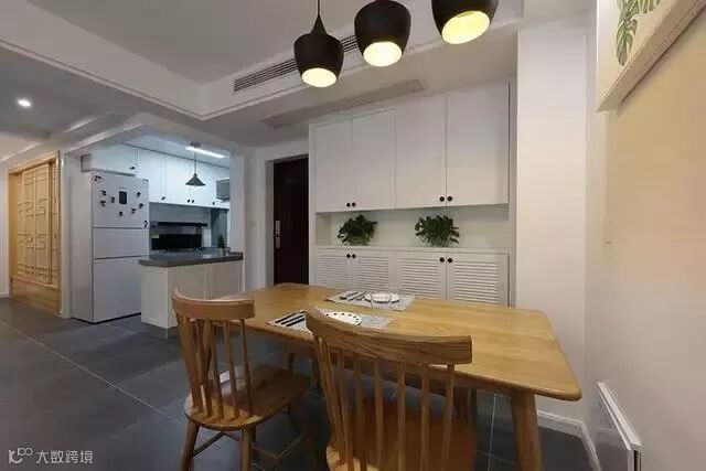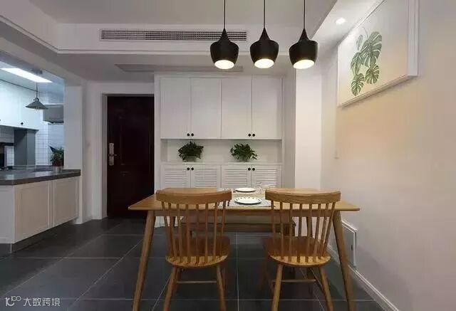餐厅和玄关,一进门左手边是必不可少的大鞋柜,右手边是厨房,装饰物仍然是自然清新的绿植;