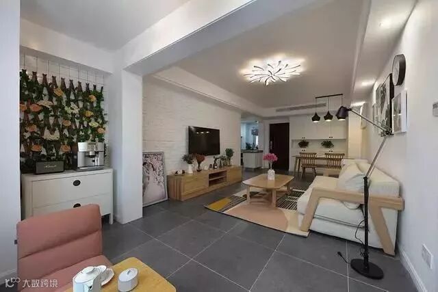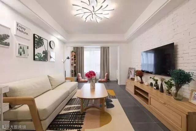电视背景墙选用的是白色文化砖,空间明亮又增添了文艺气息;