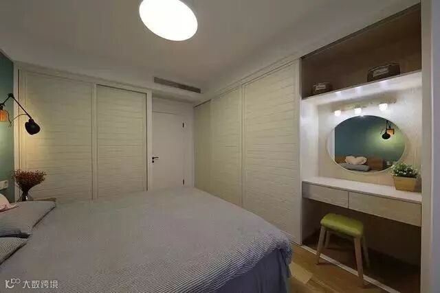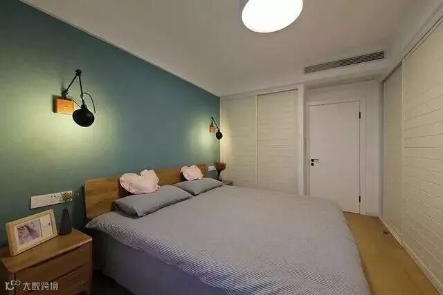 主卧的衣柜、卧室门都选择了白色,同时将一面墙刷成了绿色,让整个空间色彩上既不单调也不杂乱;