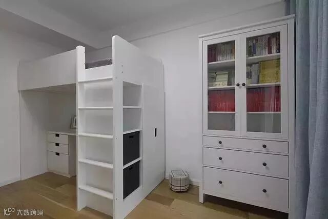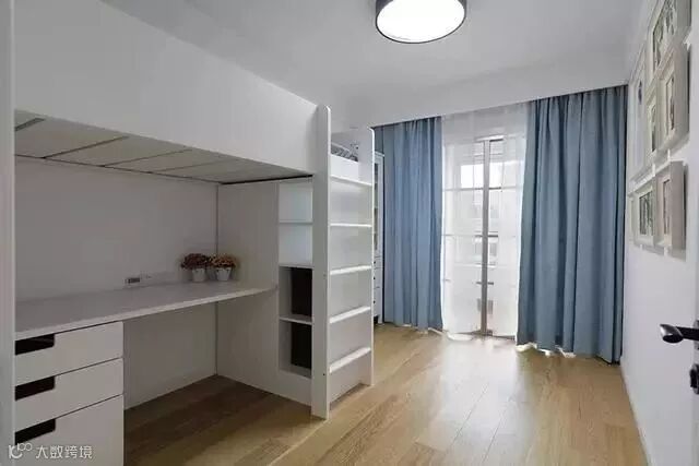 次卧的主色调仍然是白色,配以蓝色的窗帘,经典而且永不出错的蓝白搭配;