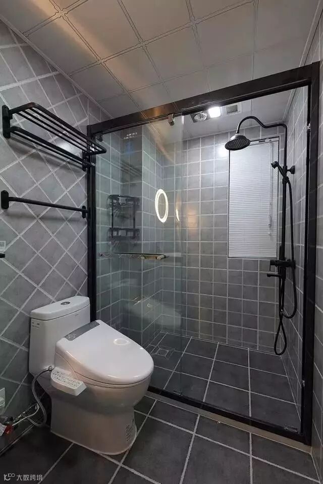 还有淋浴间的花洒和置物架,小编个人也是非常喜欢这种黑色的五金的,强烈推荐给类似风格的家装;