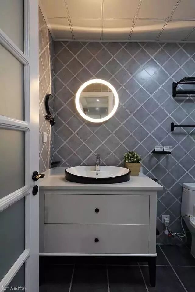 卫浴间使用了浅灰的方砖,注意一下墙上的毛巾架,还有门把手,都选用了黑色,这一点和厨房的五金相呼应;