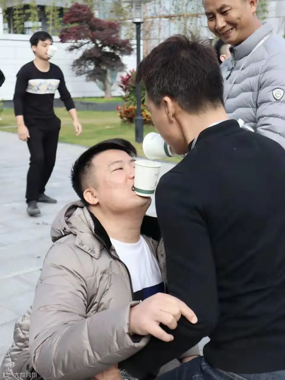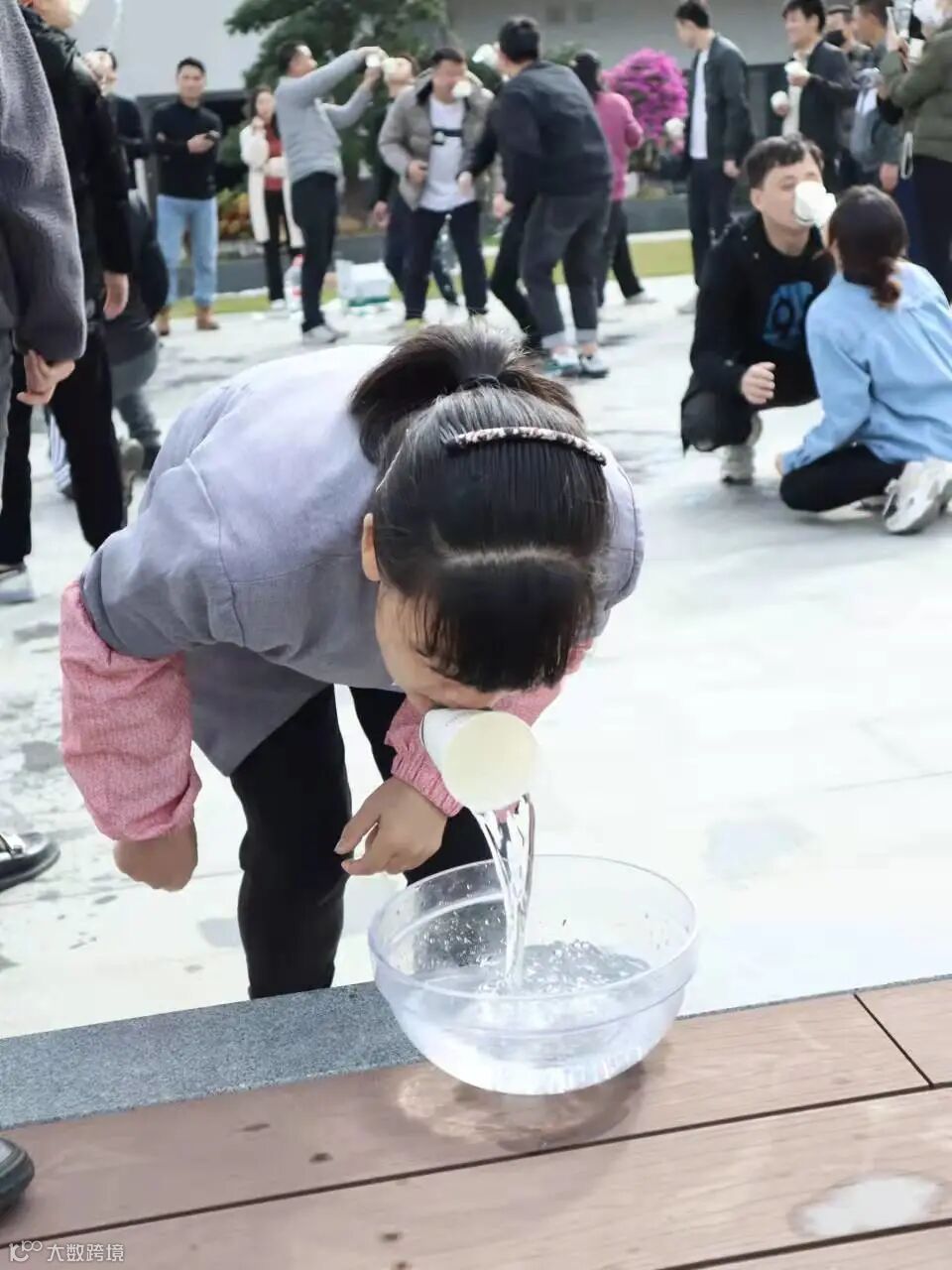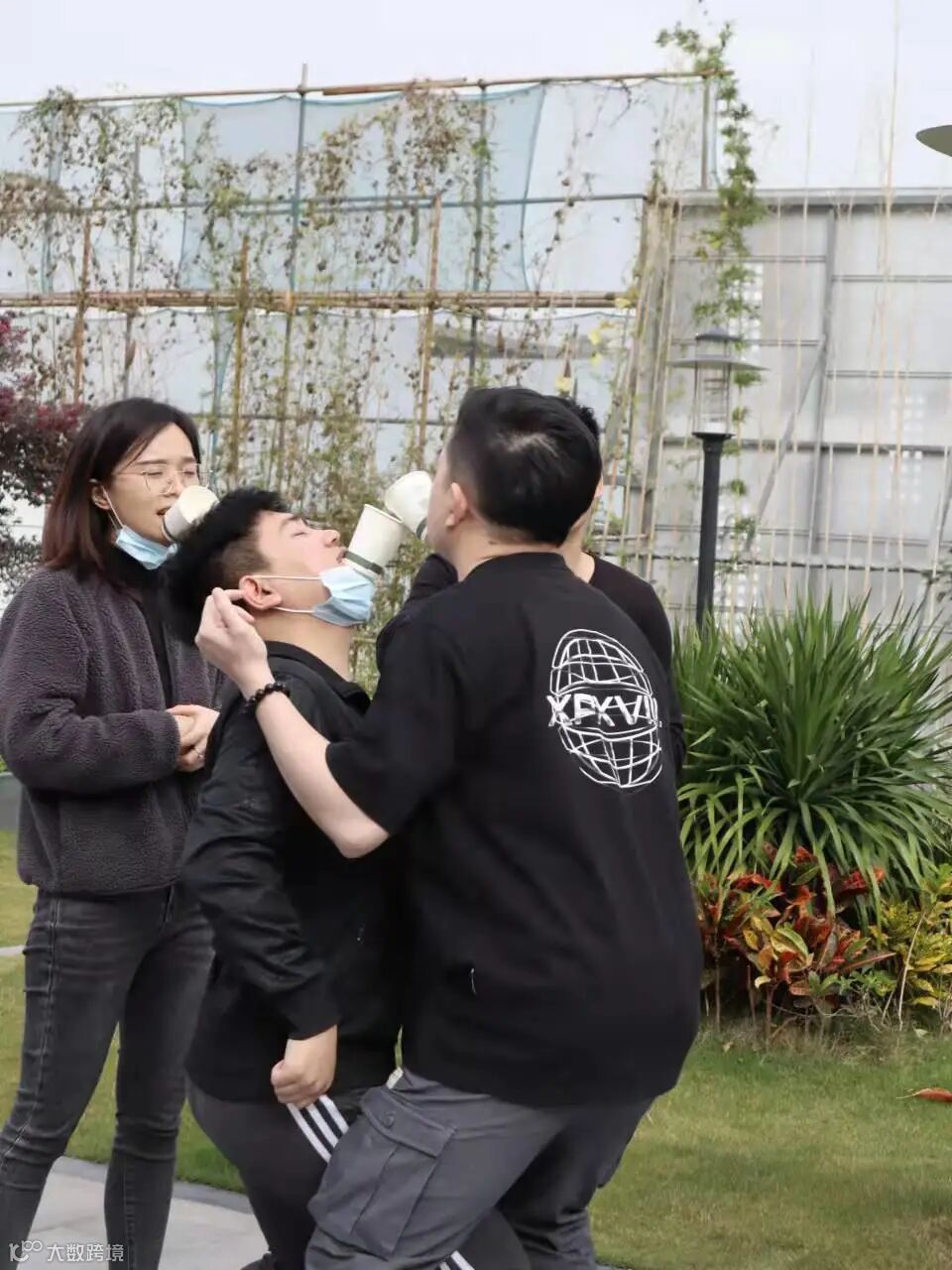 活动项目是用嘴叼住纸杯,将水传给下一位队友,