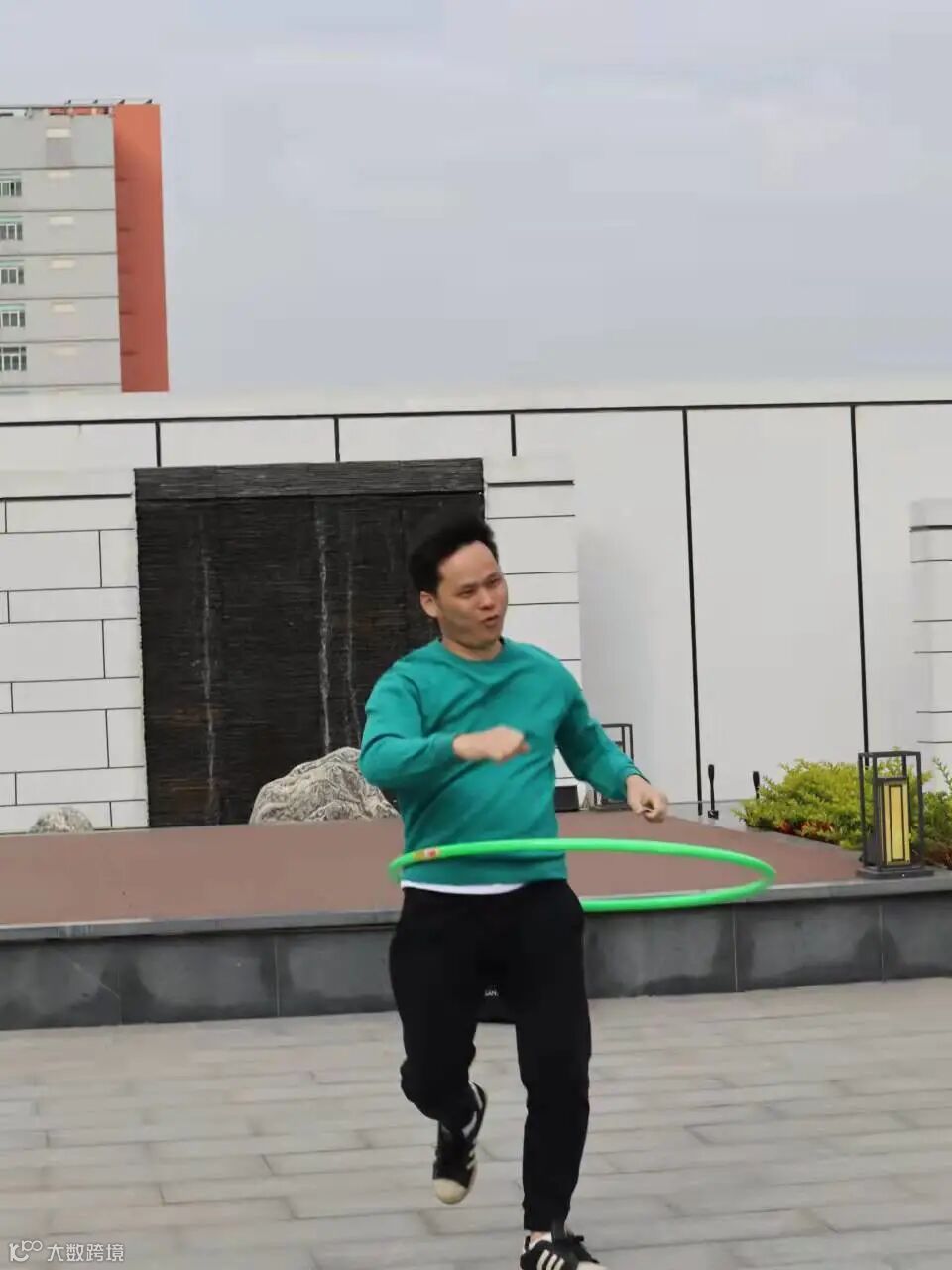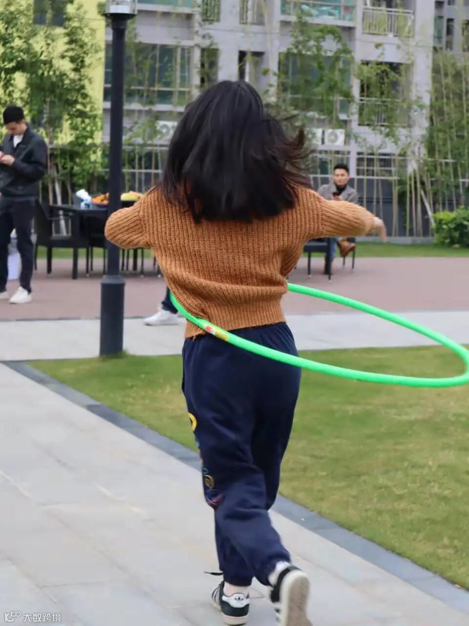 起点队员手持呼啦圈,一边走一边转呼啦圈。