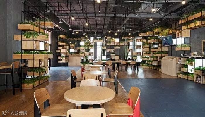 设计理念:咖啡馆装饰呼吸新鲜空气,咖啡馆内部由建筑钢筋搭建起来的栅格结构分隔着内部空间,同时在栅格中融入盆栽、书柜及灯饰等多种功能的物件,营造了一处温室花园的氛围,在这里品尝一个下午茶,不仅舒缓了都市的紧张节奏,同时也获得了回归田园的生活体验。