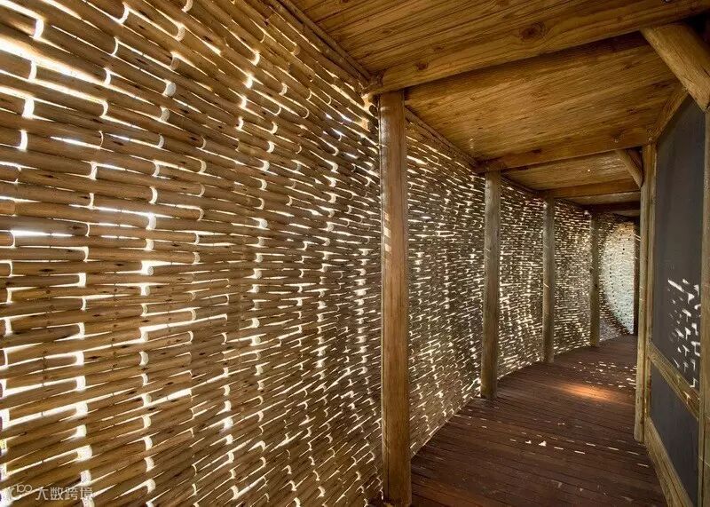 酒店整体结构由一排排弯曲的松木构建而成,就像动物的肋骨,支撑起覆盖着加拿大雪松木瓦的屋面,就像动物的鳞片。远处看去,整个酒店就像一个大型哺乳动物,盘卧在林间……