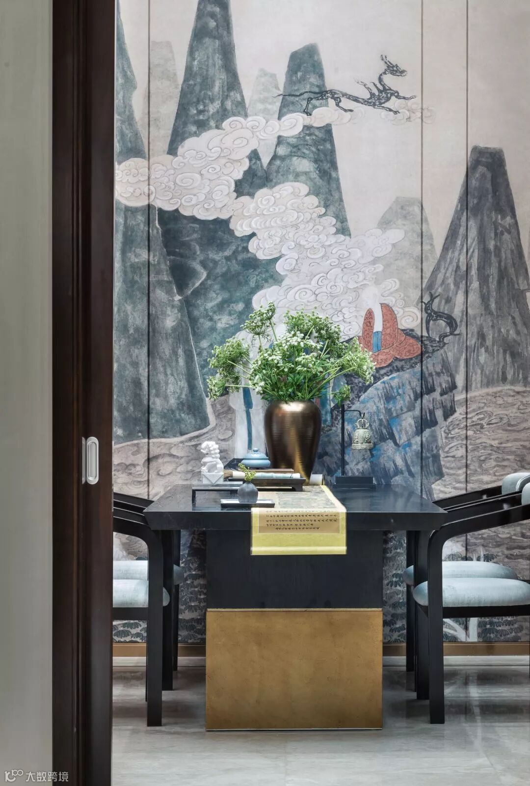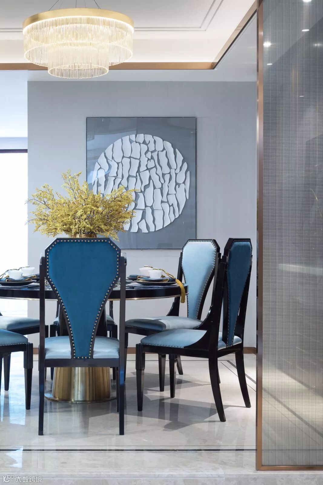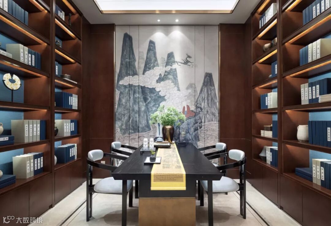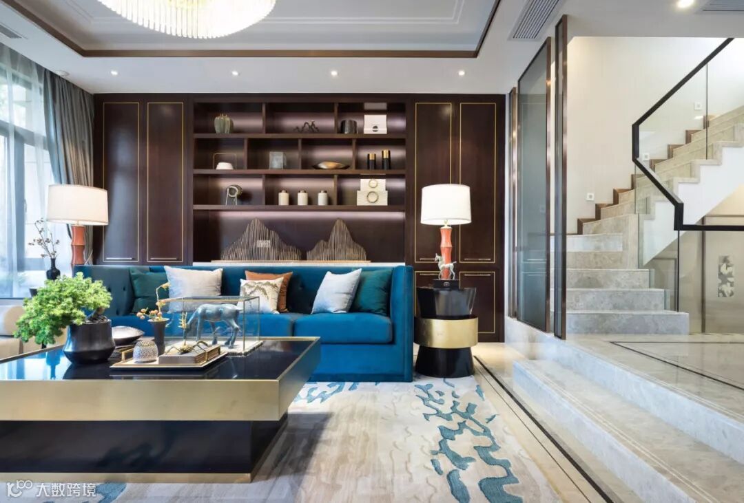 翠蓝色丝绒沙发,黑檀茶几,金属山型装置,抽象挂画随机映入眼帘,现代的设计手法、颇具新古典韵味的家具与东方古典装饰元素自然斜街,设计师巧妙呈现西形东韵的空间气质。