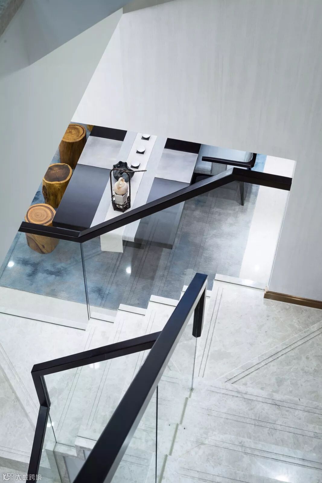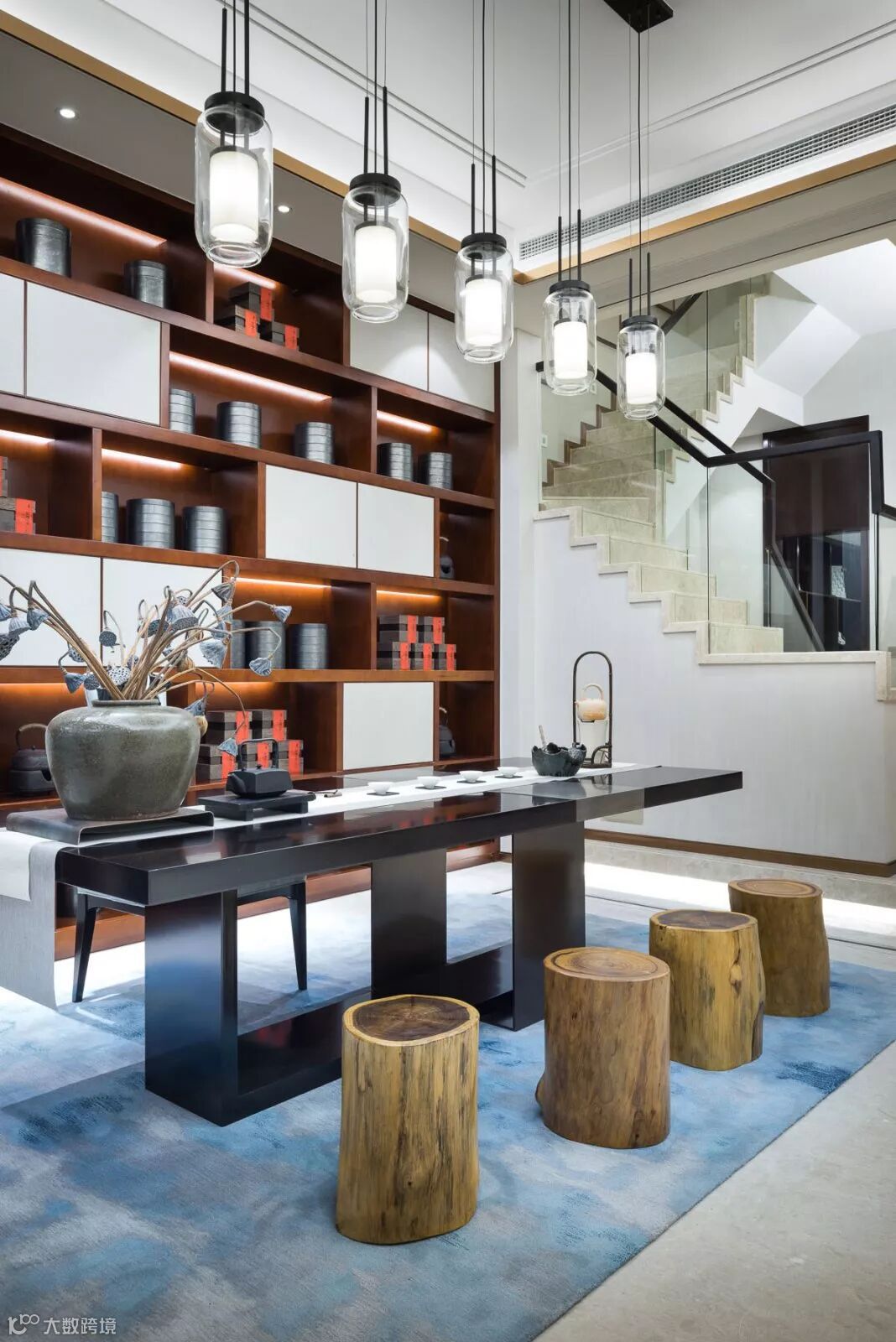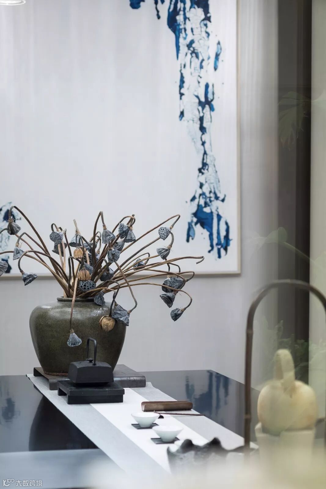 翠蓝色丝绒沙发,黑檀茶几,金属山型装置,抽象挂画随机映入眼帘,现代的设计手法、颇具新古典韵味的家具与东方古典装饰元素自然斜街,设计师巧妙呈现西形东韵的空间气质。