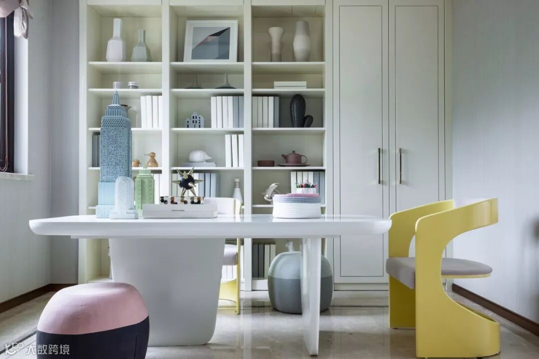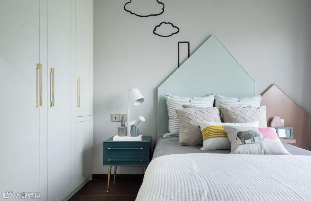 女孩房,以马卡龙色为基本色调,几何图形与家具的线条互相呼应,在柔和的色调中透着趣味。