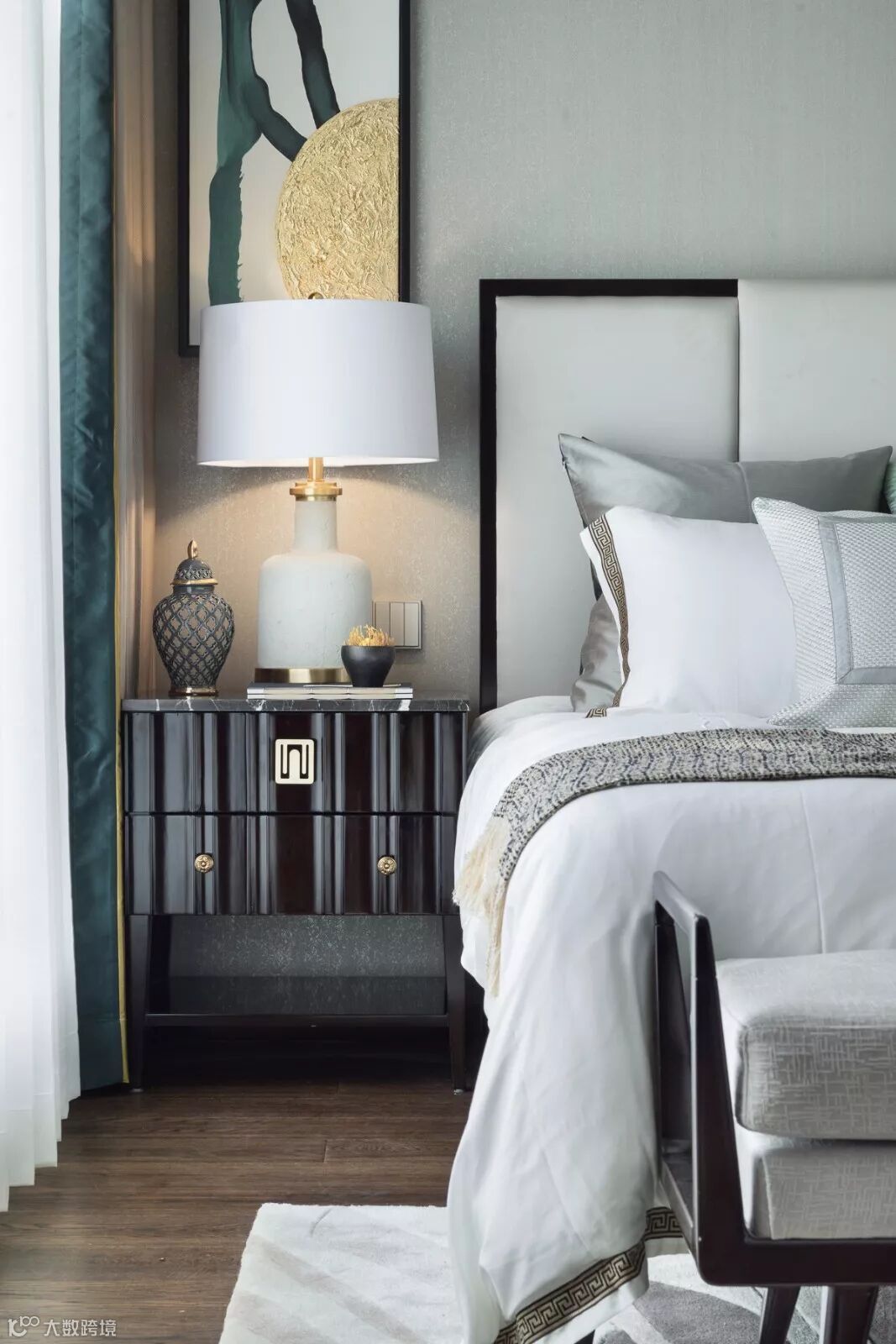老人房一派“鎏金岁月”光景,宁静素雅的空间调性中运用了高贵金与草木绿注入活力,黑檀木饰面的沉稳、丝质软包的优雅、古典瓷器的温润,在艺术中沉淀生活的品位。
