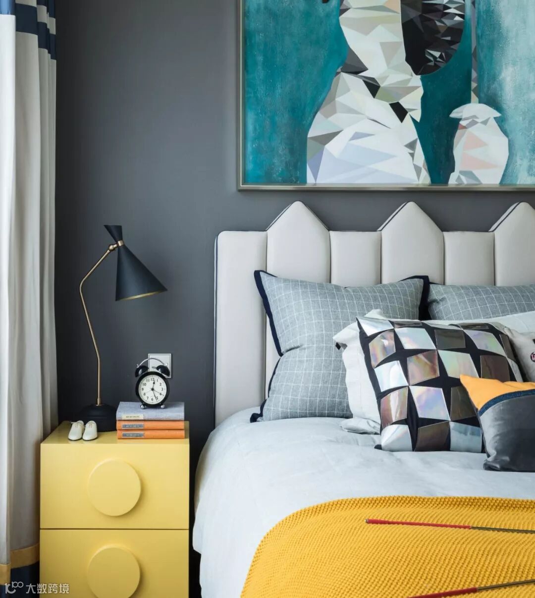 主卧以米灰色为主,点缀以蓝色与橘色床品打破空间的沉闷,饰品的选择上则宜古宜今,在柔和的美感中让空间呈现惬意愉快的气氛。