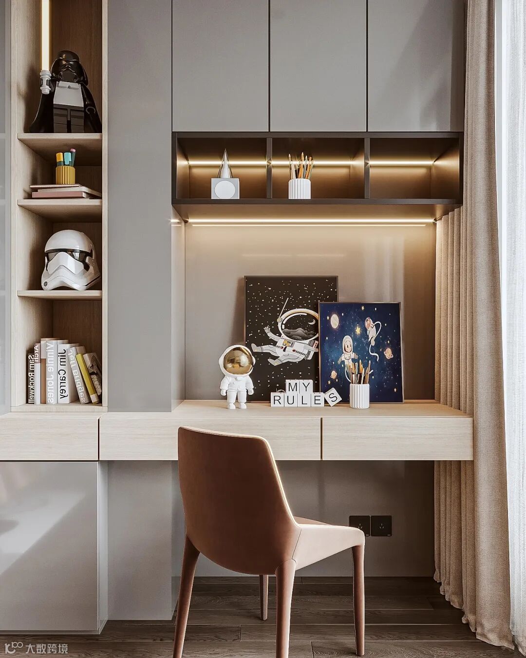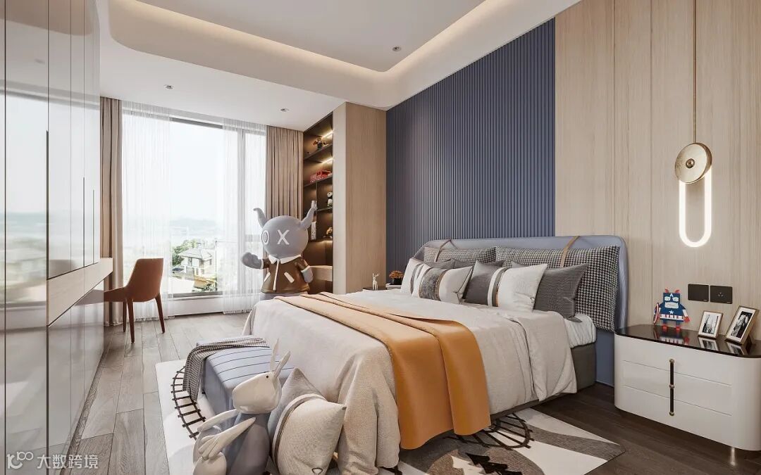 儿童房设计以冲突与美感开启氛围,海蓝栅格与木饰面拼接,连接定制装饰柜,让整个空间就像理性的你温柔的拥抱着我的感性,理解彼此融洽生活