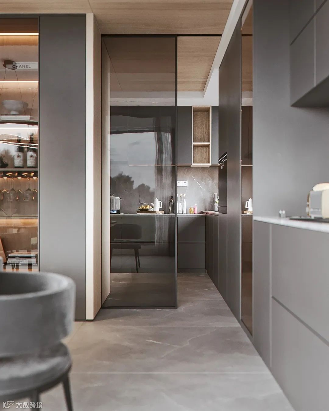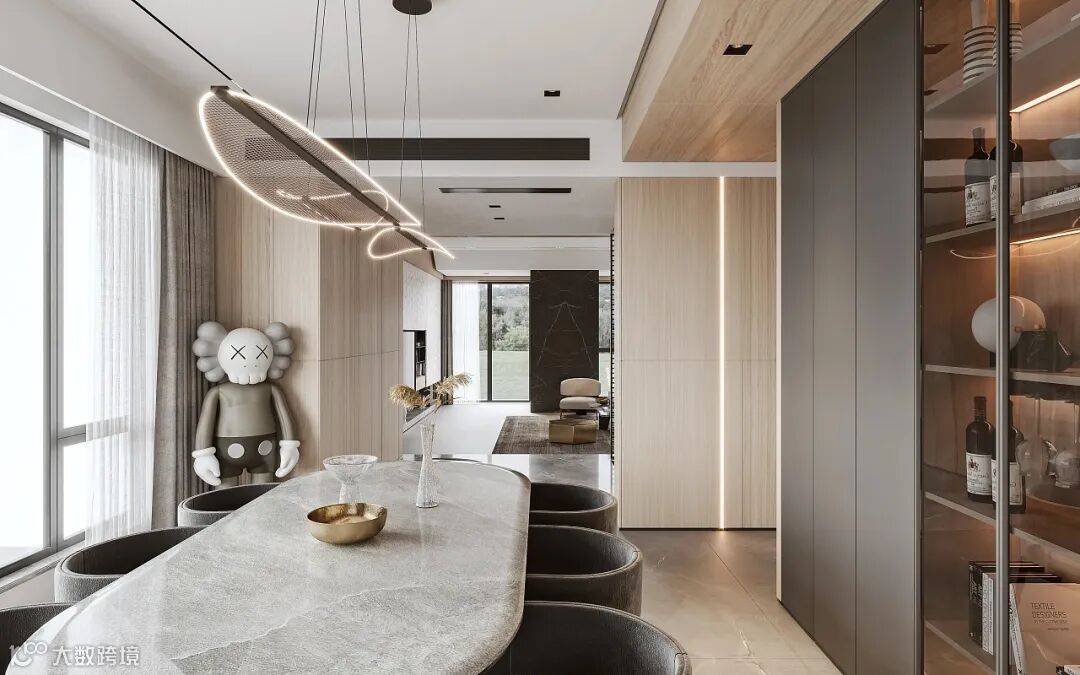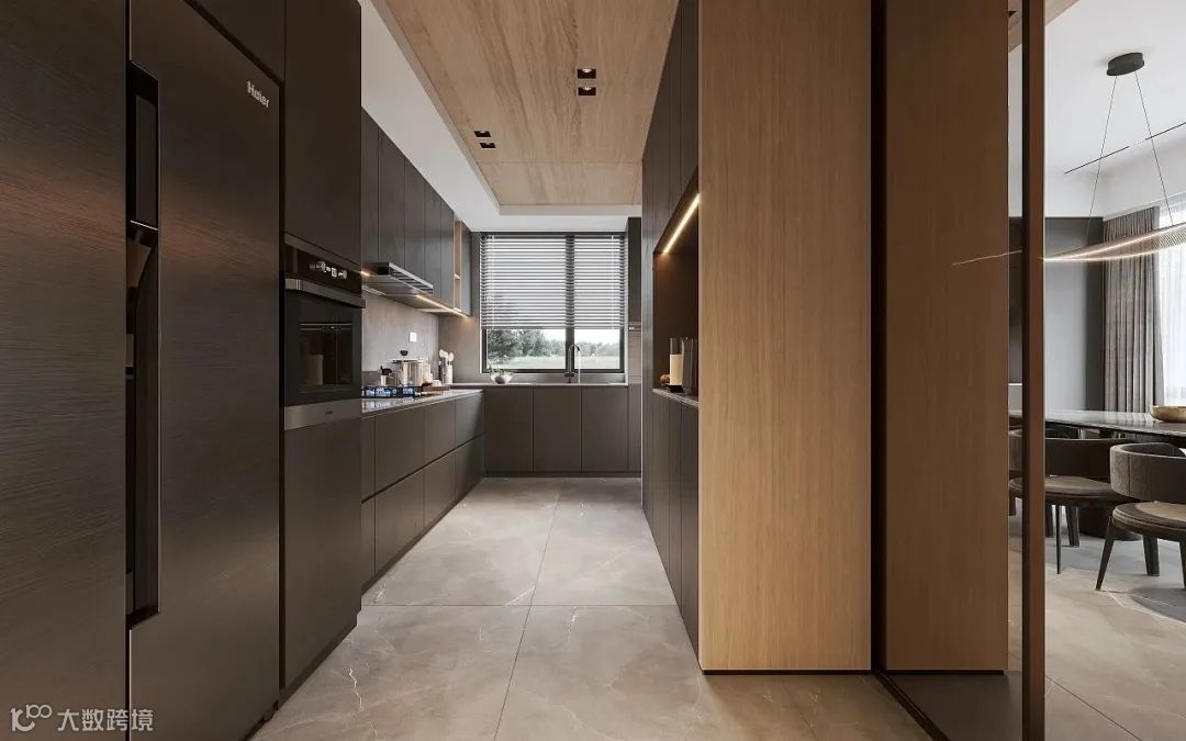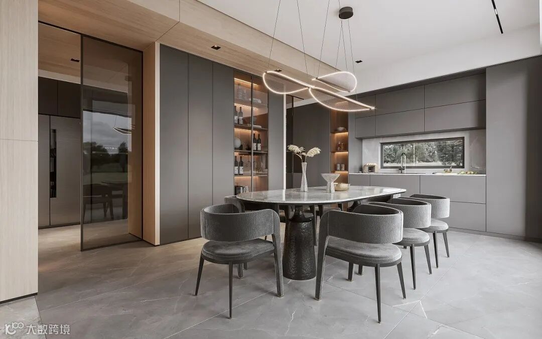 延续着客厅空间的流畅动线,独立厨区以极哑肤感板为主要的视觉指引,一体式的一字型操作台,以展示酒柜与用餐区分离,将备菜炒菜到进餐的动线规划得清晰明了,几乎不用太多的厨房经验,就能料理好一顿美味