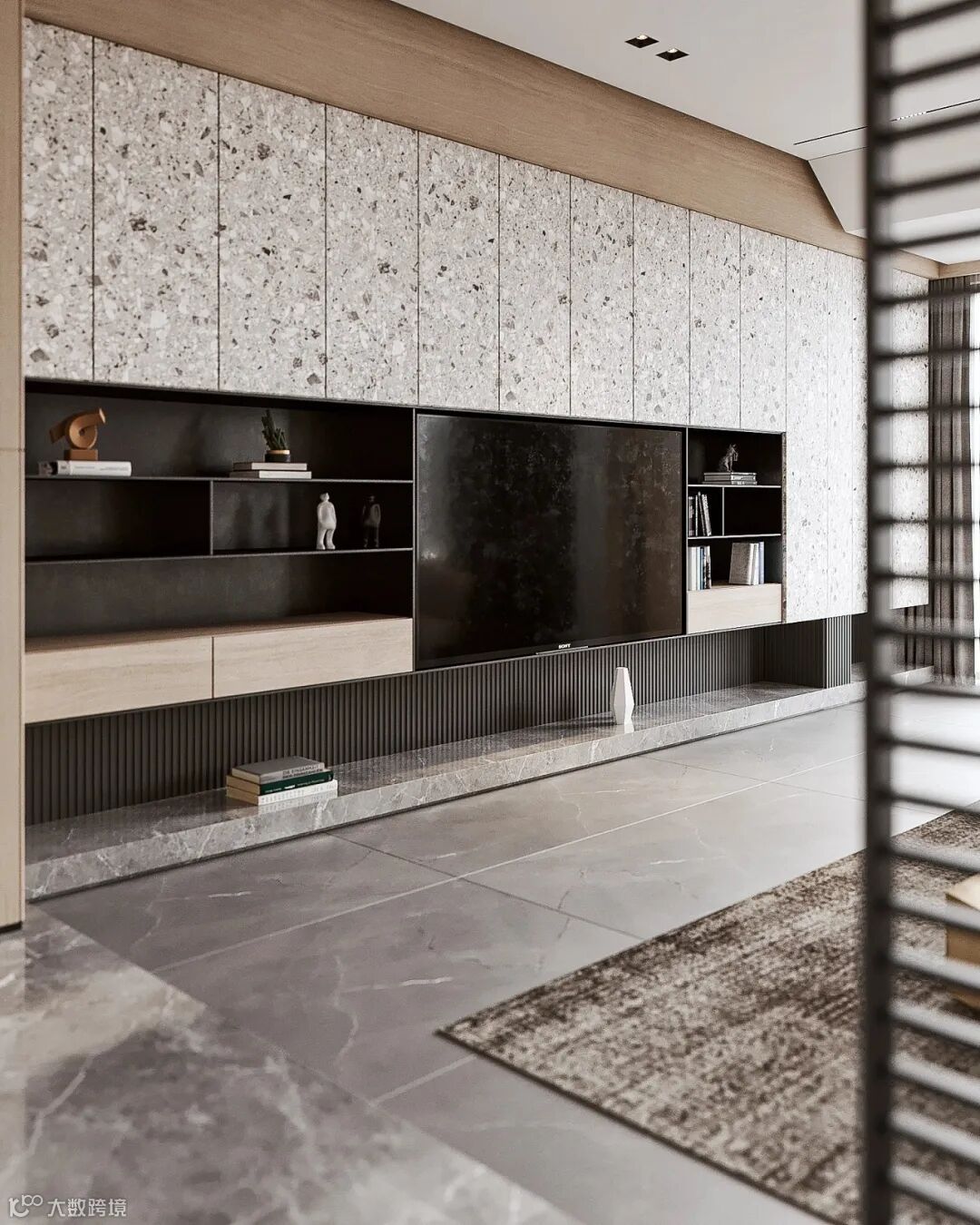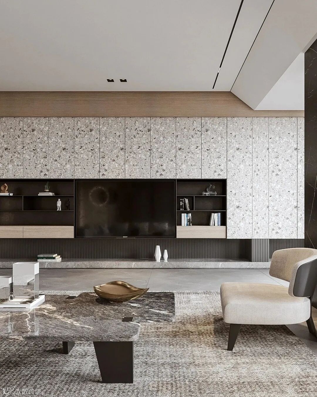 以社交和共享为主题的客厅空间中,多功能电视背景墙以一体墙柜拼接双饰面,水磨石纹与整木纹理的交织,功能与功能的融合,互相彰显也各自纯粹,交汇出温和、明媚的生活姿态