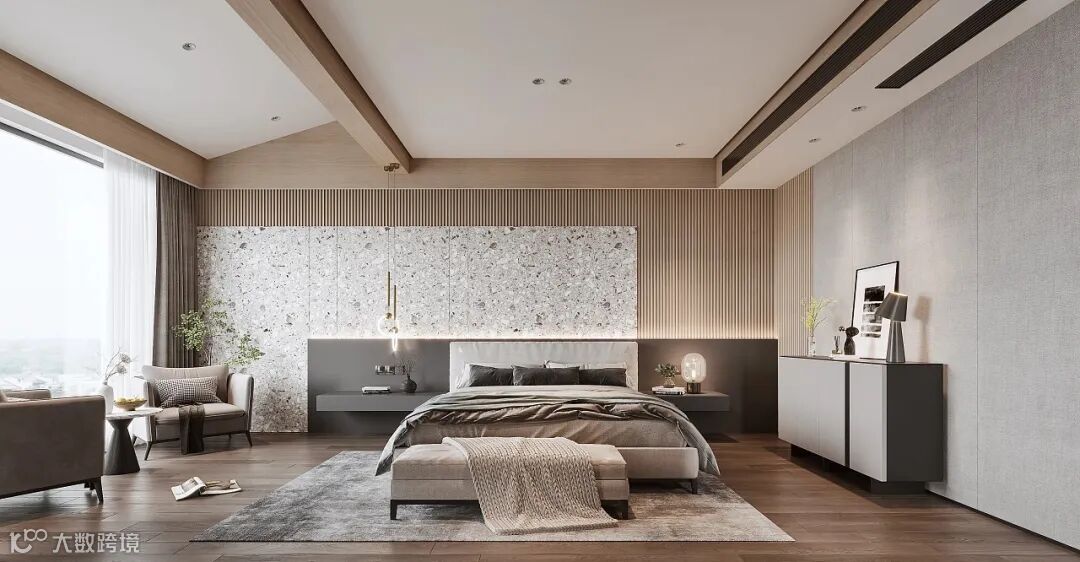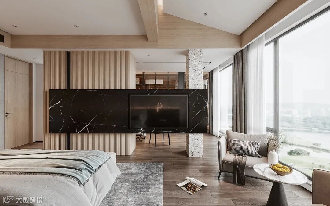 主卧是专属于户主的私密空间,因而个性与格调都尤为突出。设计师借鉴孟菲斯风格的灵感,将不同材质以大小色块“拼”在了墙上,多元材质的碰撞火花与几何变形的魅力,都让主卧变成了一首欢快的约德尔小调——材质与音符都肆意飞扬