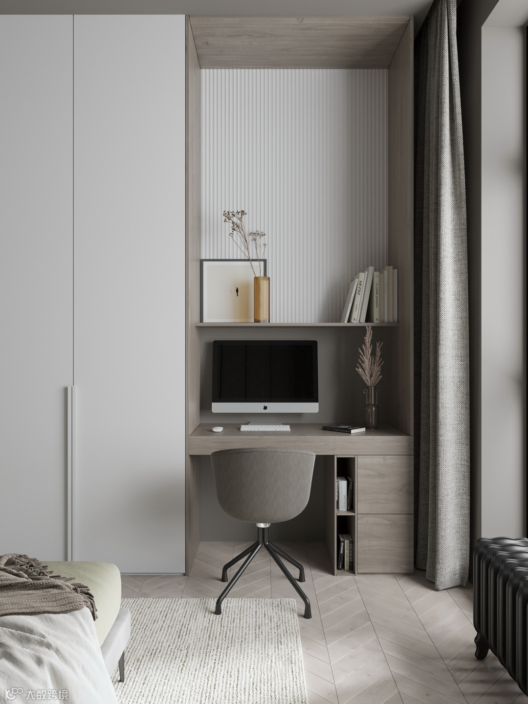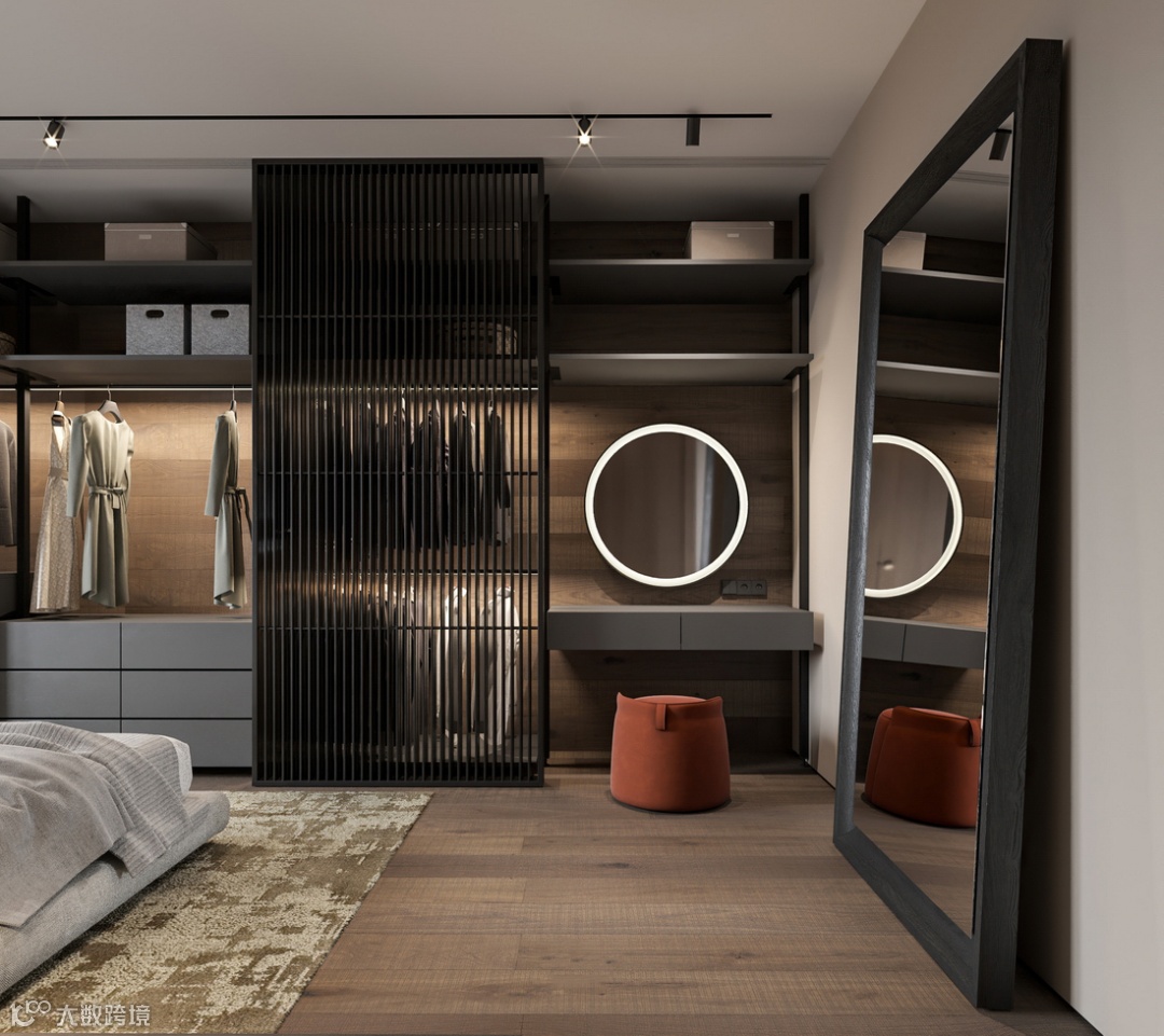 在现代卧室视觉呈现中,简约的半面高级灰整木在原木墙板中相辅相成,以美学的视角去诠释安静平和的卧室空间,配合定制床头柜的功能化呈现,让休憩成为生活艺术的承载,营造出愉悦放松的一方天地,使之成为年轻个性都市人的灵魂居所。