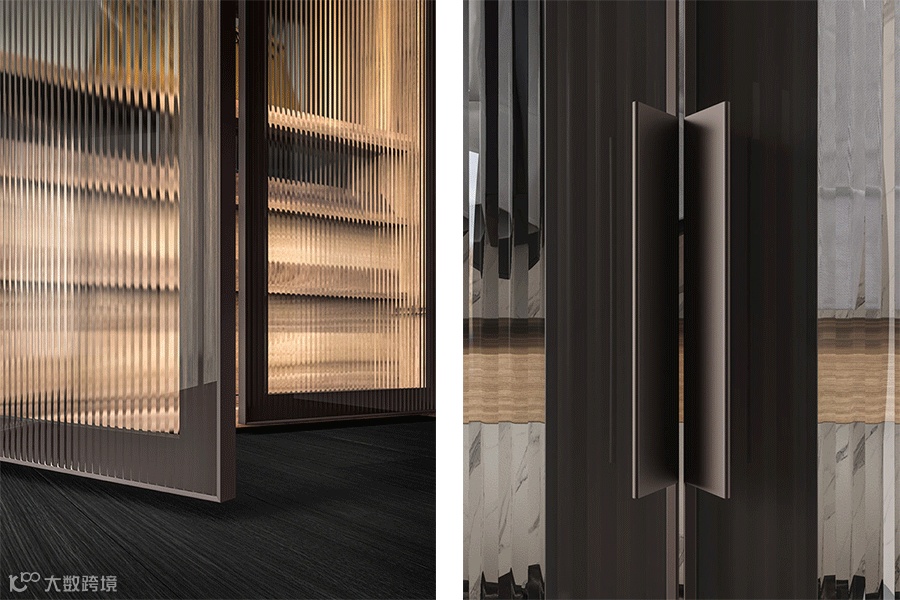 L型步入式衣帽间系统中,设计师将属于材质的特点进行了淋漓尽致的展现,全开放的展示格局下,通过简练的结构引导和立体的纹理延伸,让衣帽间氛围呈现出独具奢美的意式氛围。