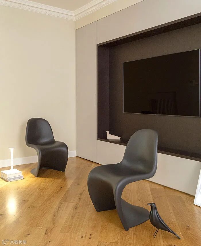在这种装饰组合中,看到其中一个与具有深色表面和轮廓的白色砖墙形成鲜明对比。这是现代电视墙结构的一个很好的例子——易于组装,线条简单。