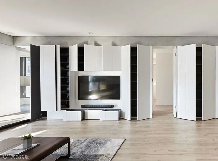 这种家具组合可以完全封闭,具有极简主义的最终外观,也可以部分开放,并根据业主和设计师的喜好为装饰物品、书籍或杂志提供额外的搁架。