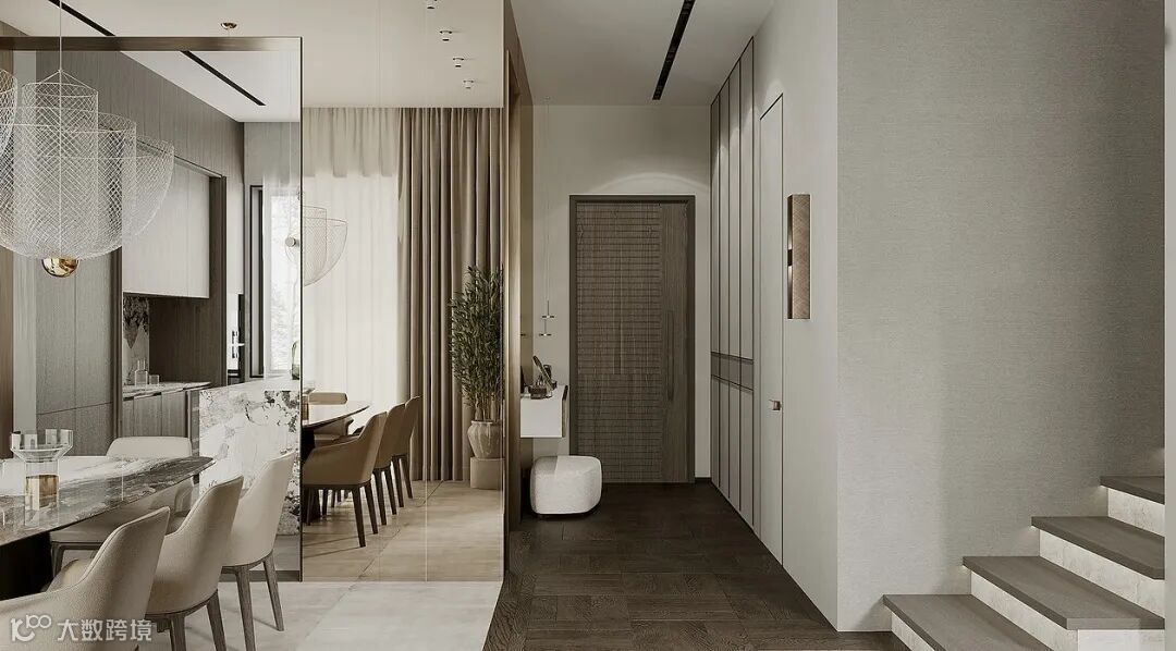 每天的生活节奏繁忙,早上的装备当然是要快速搭配,拥有一个多功能且易拿取的衣帽间是都市人的福音。通过一体化落地的表达形式,一目了然地看清楚物品,方便拿取,颜色上则以木纹搭配玻璃来呈现出简约又不失丰富,加以屋顶的石膏线,亦有别样意趣。