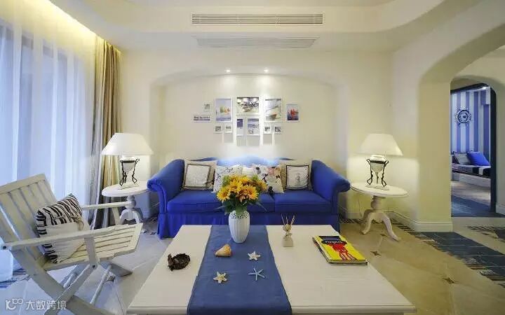 地中海风格如此地特别,就象在我心里的你一样。蓝色配以白色、黄色,像男生硬郎的外表下有温柔的一面,如女生宁静的外表下有一颗追求爱情勇敢的心。房间内零星散落的海星,可以帮我们找回沙滩上的回忆。
