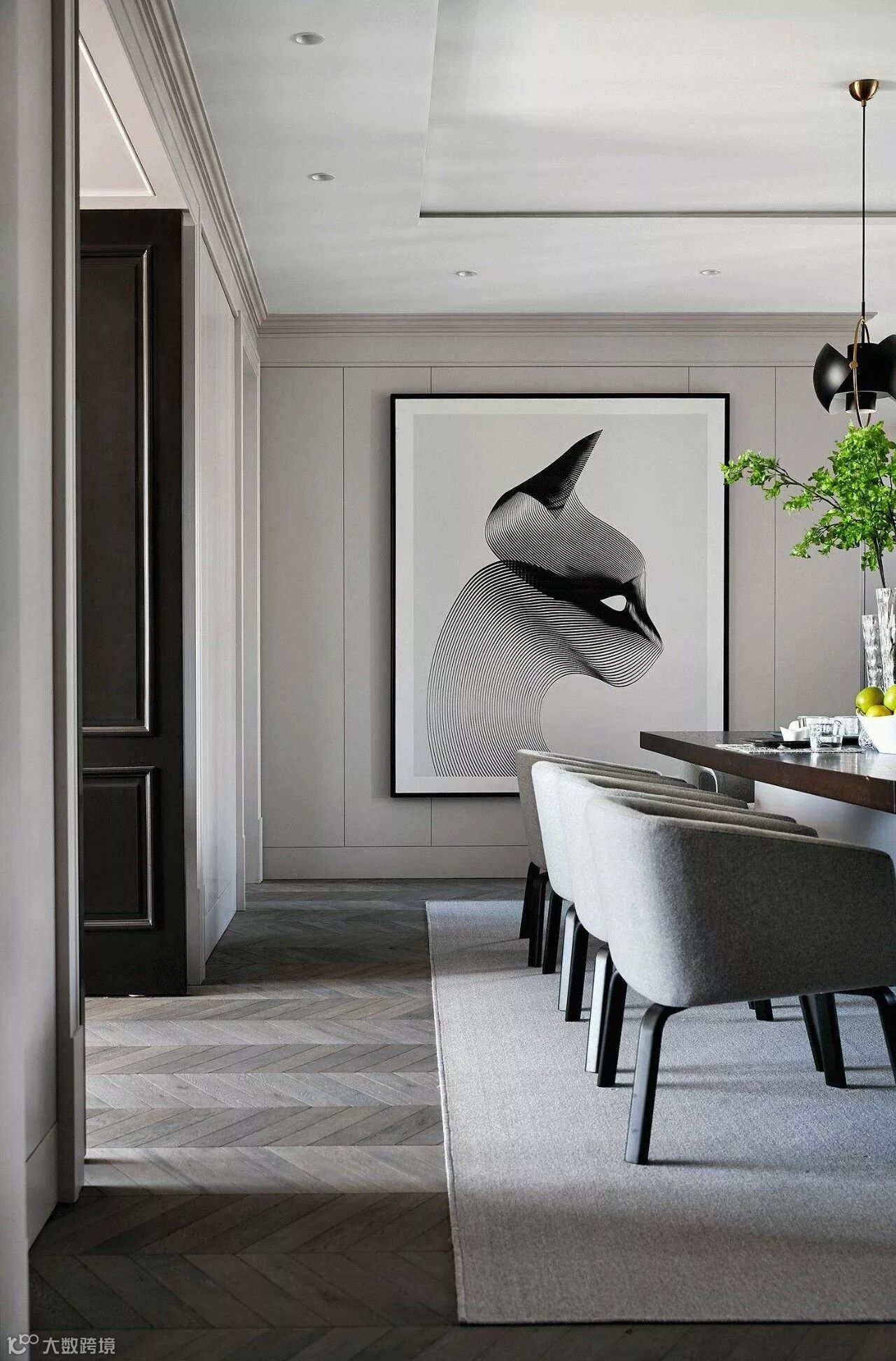 较深色踢脚线会有拉低层高的效果,当选用深色系踢脚线时,可以从统一性出发,选择和门框、地面或墙面一样的颜色。弱化踢脚线的存在,并且拓展了地面的空间。