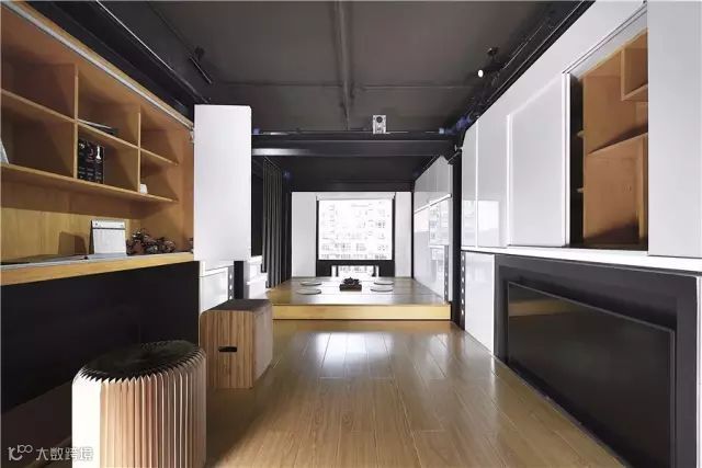 把靠窗一侧的楼板降到中间,拉出藏在柜子下方的凳子,放下幕布,就是个家庭影院了。