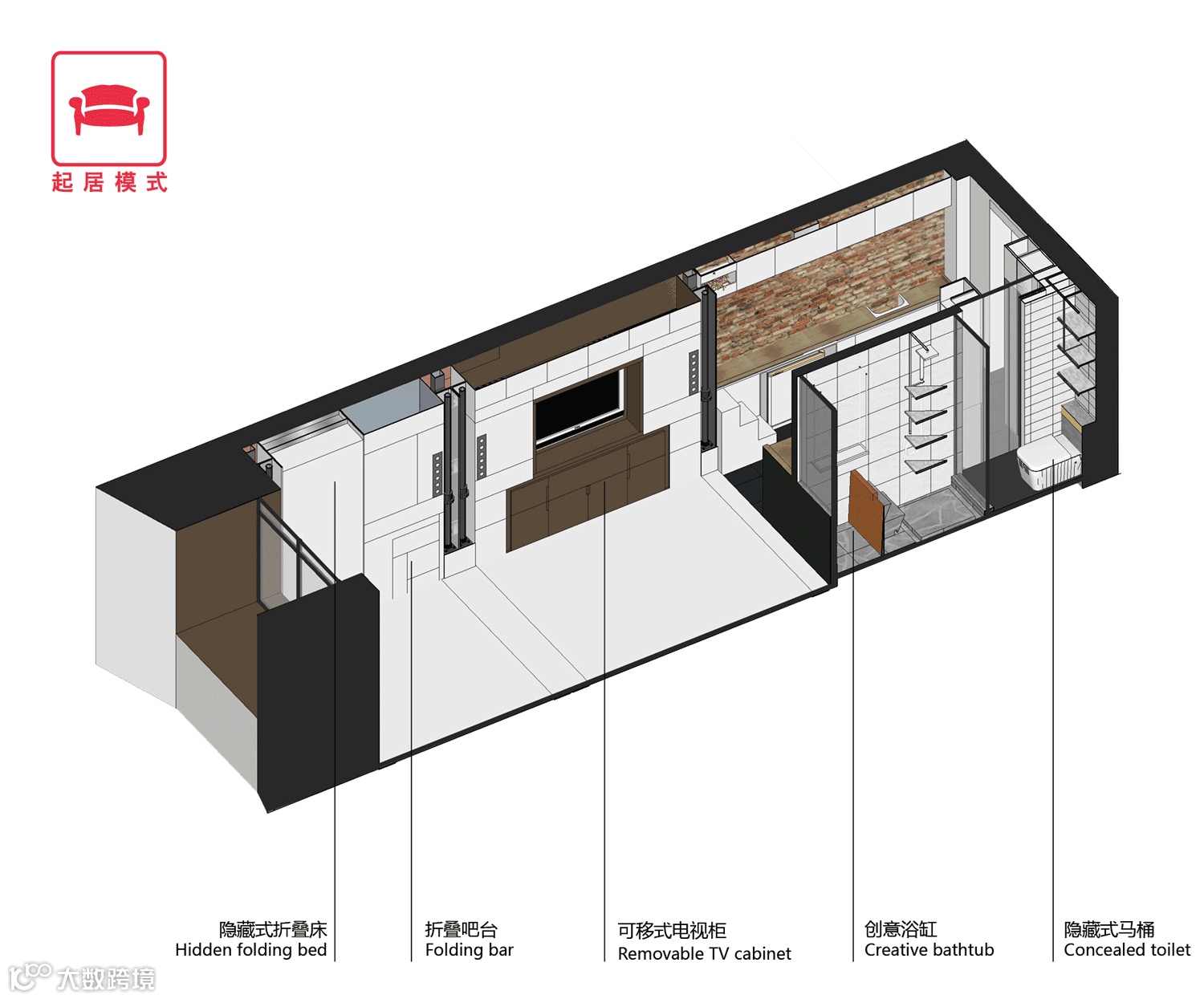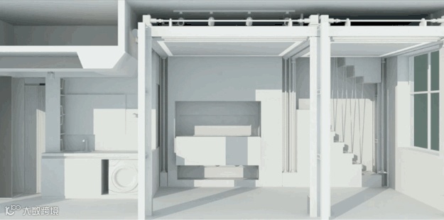 将楼板设定为不同高度,再配合20个折叠家具,就可以在小空间玩出“变形金刚”的效果,包含起居、睡眠、工作、健身、娱乐和多人居的6种模式。
