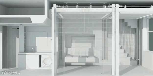 两块楼板都降到1米左右时,里边是书房,外边是榻榻米。