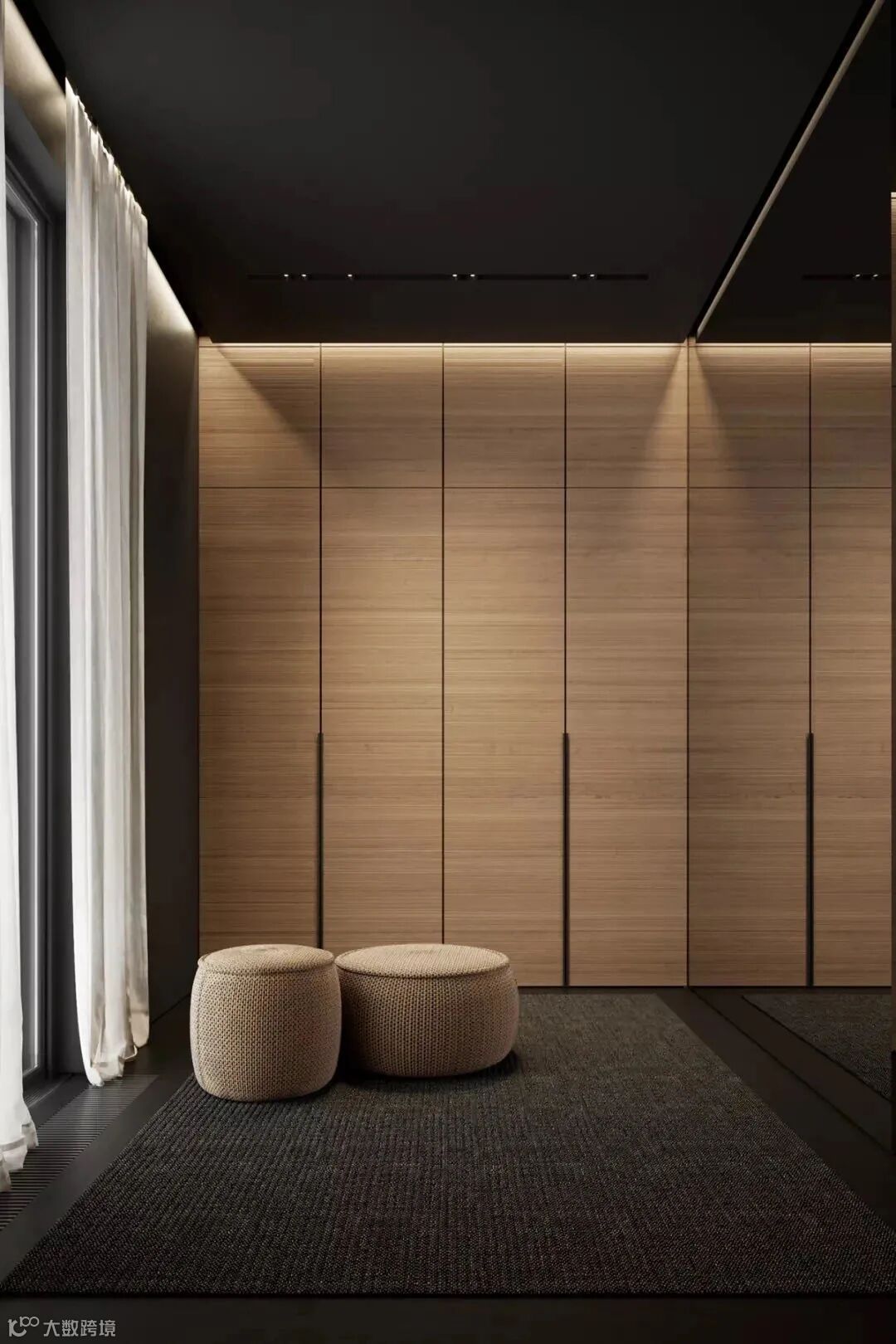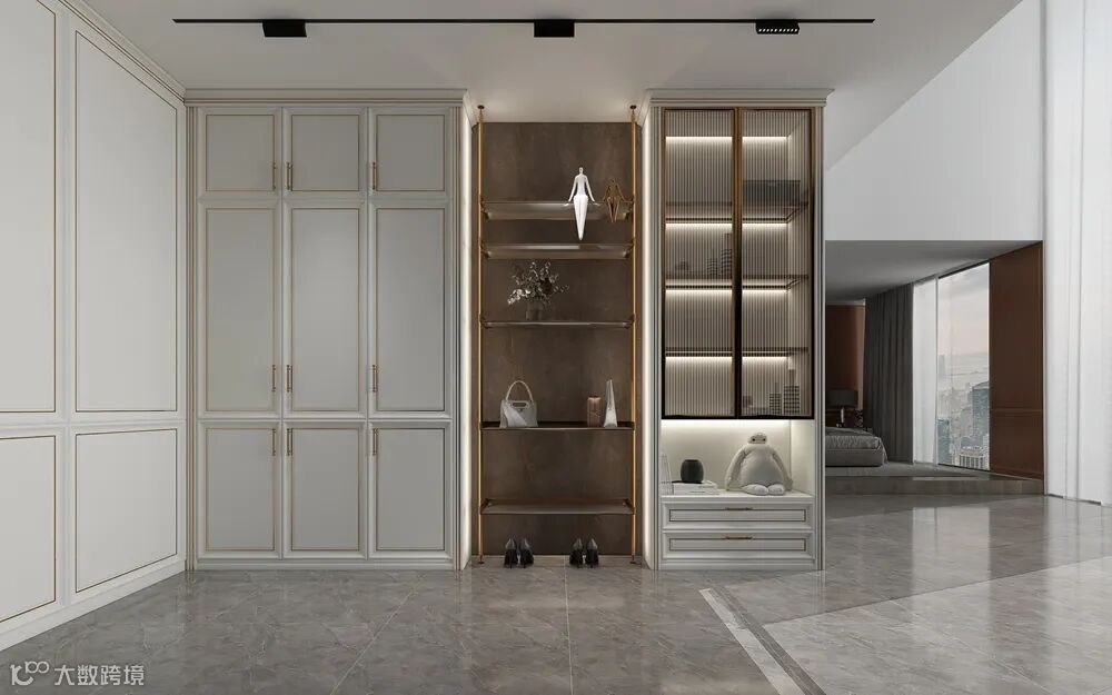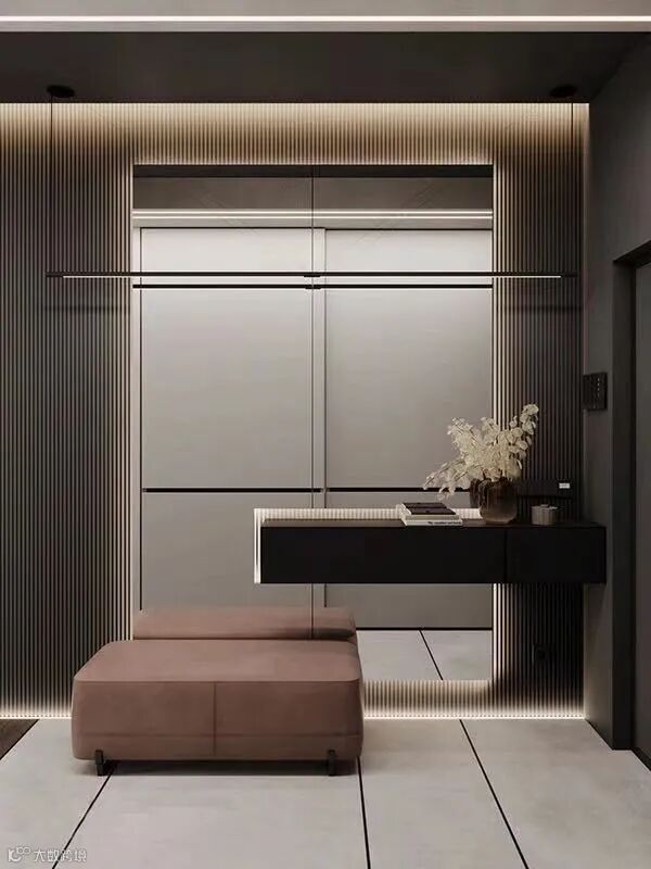 在玄关处可配置吊灯、吸顶灯、嵌入式灯条作主灯,再添置线性照明或小光束角的射灯照明来点亮饰品摆件,给玄关烘托温暖的氛围,玄关柜内也可设计感应灯具,在开启门扇的时候自动亮灯,方便拿取物品。