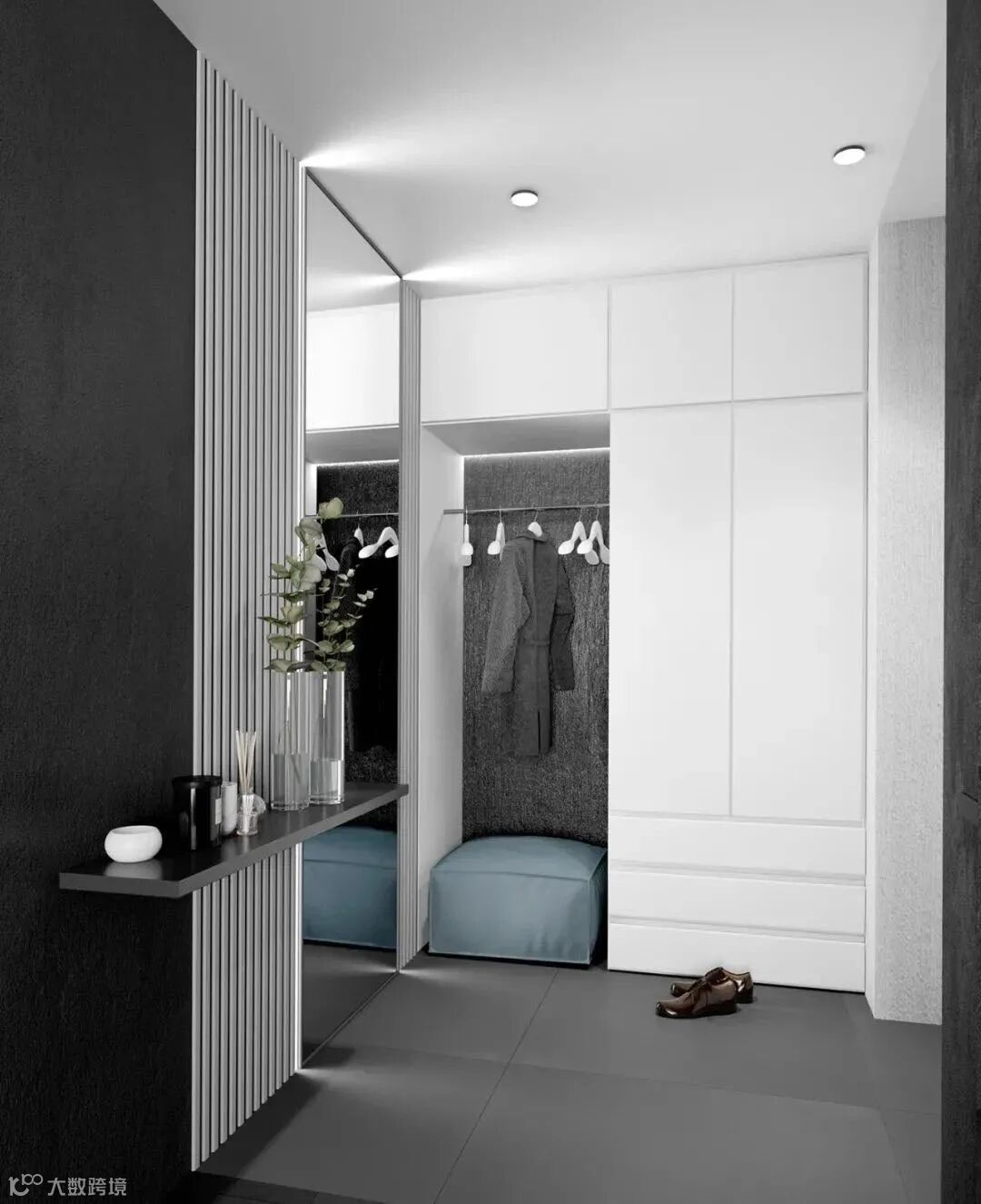 除了功能性以外,在玄关处添置照片、绿植、花瓶、干花等装饰,也能提高玄关的颜值,另外,如果空间允许的话,也可以加一个全身镜子,不仅可以让主人在出门前整理装束,还可以扩大视觉空间。